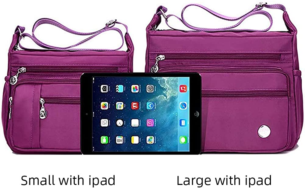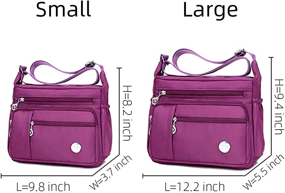 Waterproof Nylon,Polyester,Nylon Polyester lining Zipper closure Machine Wash Material: Made of Polyester lining lightweight waterproof nylon with classic zippers,smooth and easy to open and close,this nylon material purse is easy to care for wipe clean or machine wash. Exterior Dimensions: Small:9.8x 3.7x 8.2 inch (L x W x H).Large:12.2x 5.5 x 9.4 inch(L x W x H).Both sizes come with an adjustable strap.Two sizes of bags meet your different needs. Mulit-Pockets: Exterior: 2 side pockets,3 front zipped pockets,1 back zipper pocket;Interior:2 zipper pockets and two open pocket.Large Capacity,This purse contains interior and exterior pockets, easy to collect your phone, wallet, keys, books, umbrella, glasses case and so on. Multi-Functional: Fashionable style,this bag can be used as a handbag,shoulder bag or crossbody bag with a variety of storage options and organization features, ideal for travel, errands, shopping, and diaper bag for parents on the go. Comfortable for your daily wear: Lightweight nylon means less stress on sensitive shoulder muscles.Even after a full day of sightseeing,shopping,or errands this casual yet stylish tote won’t tug. Show more