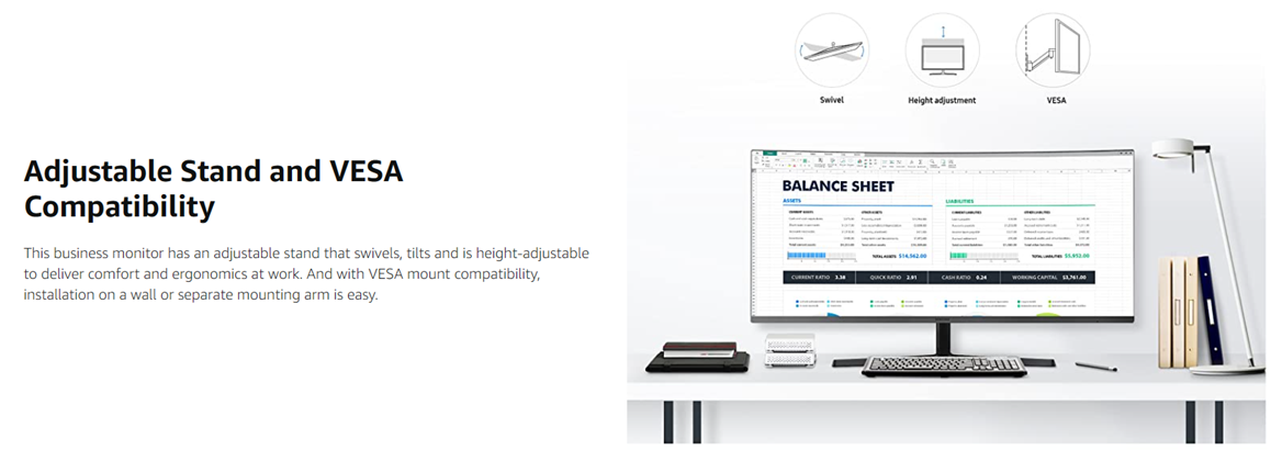 The Samsung CH890 34-inch Ultra-Wide Curved Monitor allows you to multitask seamlessly. The monitor's picture-by-picture capabilities let you connect to two different devices at the same time while maintaining original image quality. Connect via HDMI, DisplayPort, or USB Type-C with just one monitor. Increase your ergonomic efficiency with an adjustable stand which can also be mounted on your wall. With 1800R Curvature, get an engrossing view of on-screen content, matching the natural curvature of your eye. Enjoy visual clarity with Ultra WQHD and a screen resolution of 3440x1440, approximately 2.5 times the pixel density of Full HD. See more details at a glance and have a complete view of web pages and documents, all with less scrolling and zooming.
