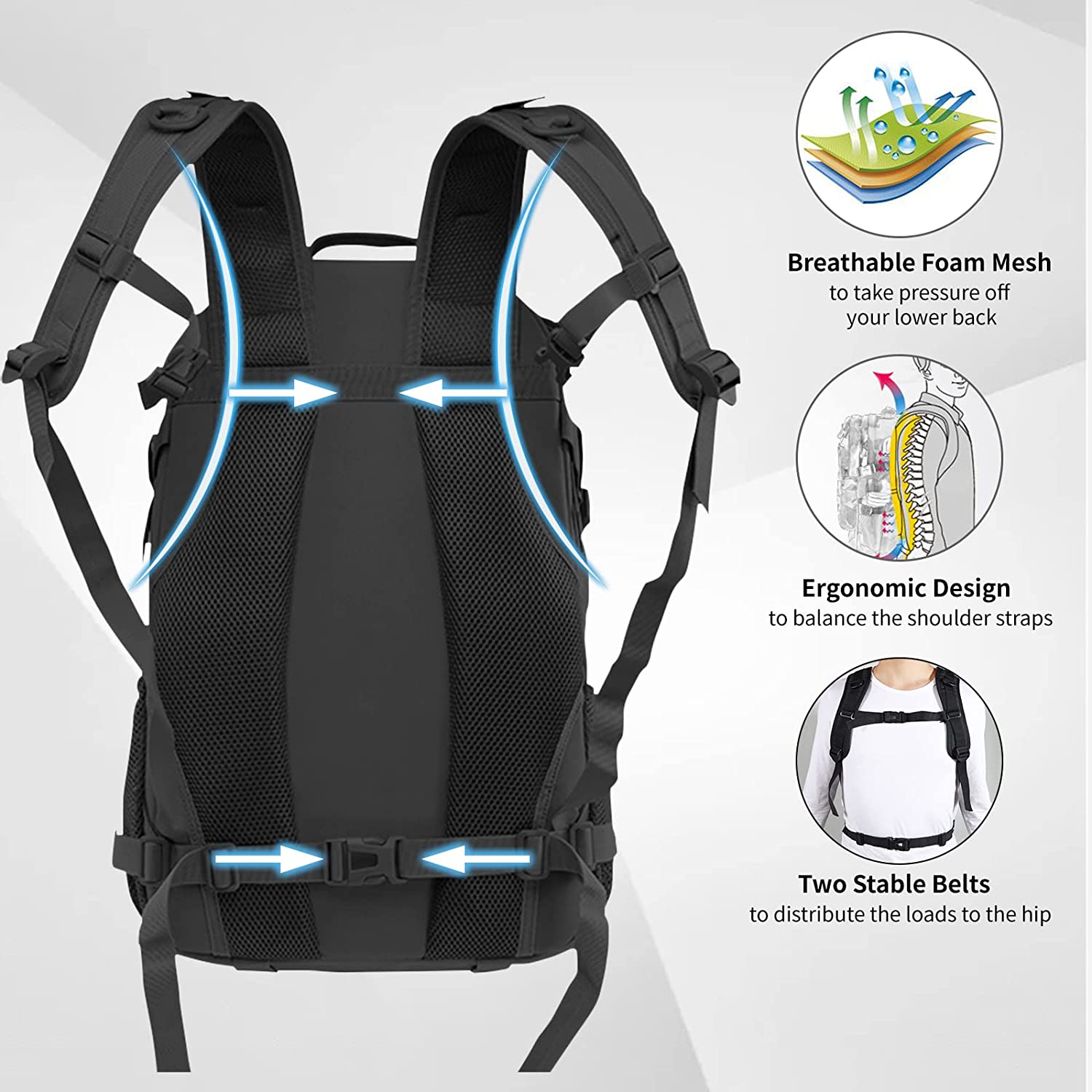- ✅ STABLE STRAPS: The chest and waist straps with fasten buckles make it easy for you to buckle the straps in seconds to stable the trekking backpack. The buckle strap on both sides and the 2 compression fasten buckle straps on the bottom enhance the army backpack’s stability when moving.