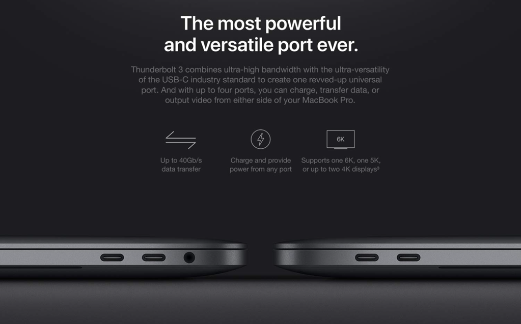 | Charging and Expansion | Two Thunderbolt 3 (USB-C) ports with support for: Charging, DisplayPort, Thunderbolt (up to 40 Gbps), USB 3.1 Gen 2 (up to 10 Gbps) |