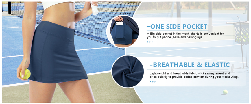One Side Pocket:Black Skirt a big side pocket on the inside mesh shorts convenient for your phone or balls.