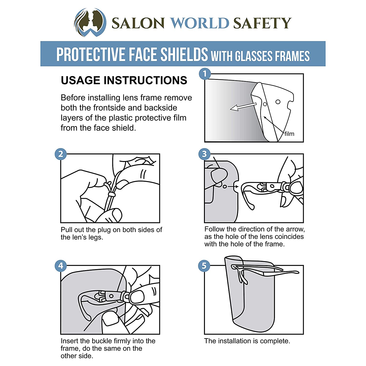 4 Pack of Face Shields with Glasses Frames: Sanitary, durable, lightweight, and comfortable premium protective face shields that are made with ultra-clear thick plastic. Each face shield contains an internally mounted comfort fit acrylic glasses frame. Wear the face shields just like you would when wearing glasses over your ears and on your nose bridge, but you'll also have a face shield for protection. Wear your eyeglasses underneath. One size fits all.
