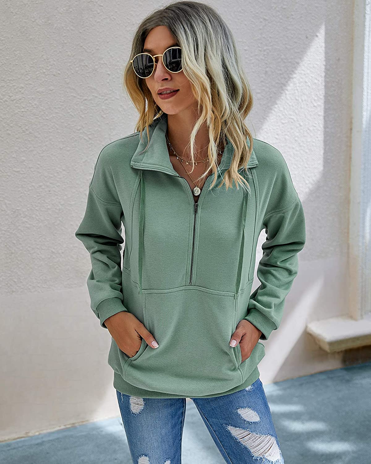 Versatile Half Zip Pullover Women: Drawstring lapel womens sweatshirt in solid color is simple yet fashion. Half zipper womens sweatshirts no hood are easy to put on and take off. Relaxed fit plain cute sweatshirts for women can be dresses up or down, perfect with leggings, jeans or shorts