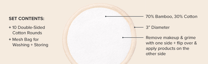 CONTENTS: 10 machine-washable 3” bamboo-cotton blend rounds and 100% cotton 4.5” x 5.5” zippered laundry bag
