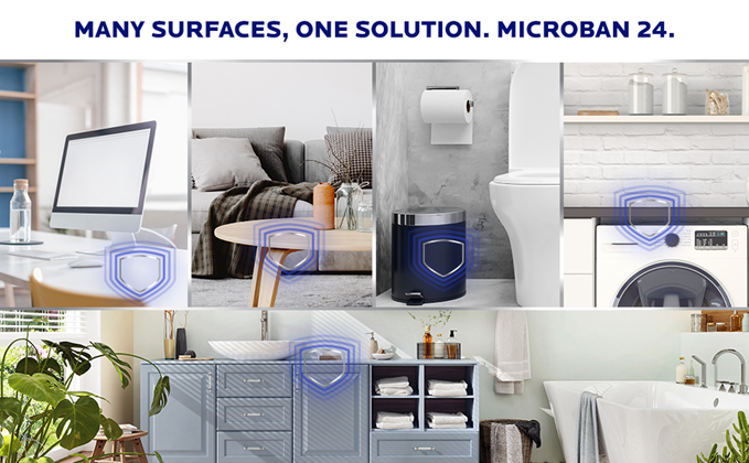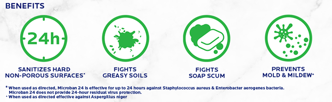 Microban 24 Hour Multi-Purpose Cleaning Spray keeps killing 99.9% of bacteria** for up to 24 Hours, even after multiple touches*, to support a clean and healthy home. This all-purpose sanitizing cleaner is great for every day messes and is suitable for use on all different types of non-food contact hard surfaces, like garbage cans, bathroom sinks, cabinets, etc. Use this multi-purpose spray for an efficient clean. Use around the home and on other high touch areas. This powerful formula penetrates soap scum and greasy soils while reducing odors. Let Microban protect you and your family from harmful germs for a healthy home. *When used as directed **Effective against S. aureus & E. Aerogenes +Effective against bacteria and viruses (Human Coronavirus, Influenza A H1N1, (RSV) Respiratory Syncytial Virus) ++ Effective against Aspergillus niger