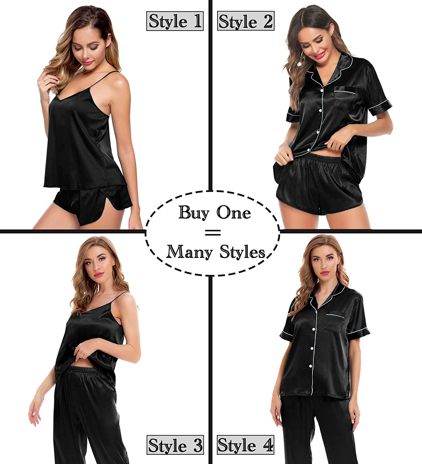 【Premium Material】--- This 4 piece pajama set is made of high-quality satin(95% Polyester, 5% Spandex), which is very soft, lightweight, and comfortable. This lightweight pajama set has a silky texture that will make you feel smooth and shiny, never pilling or fading, and help you sleep well, dreamlike.