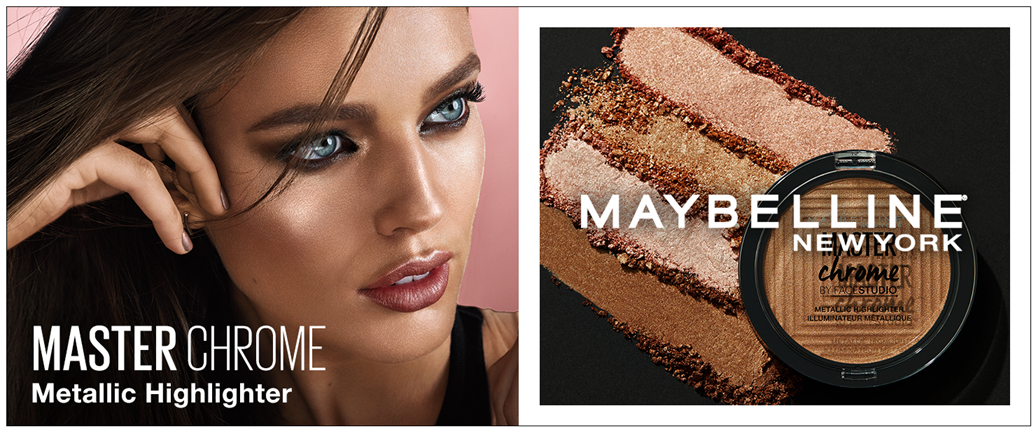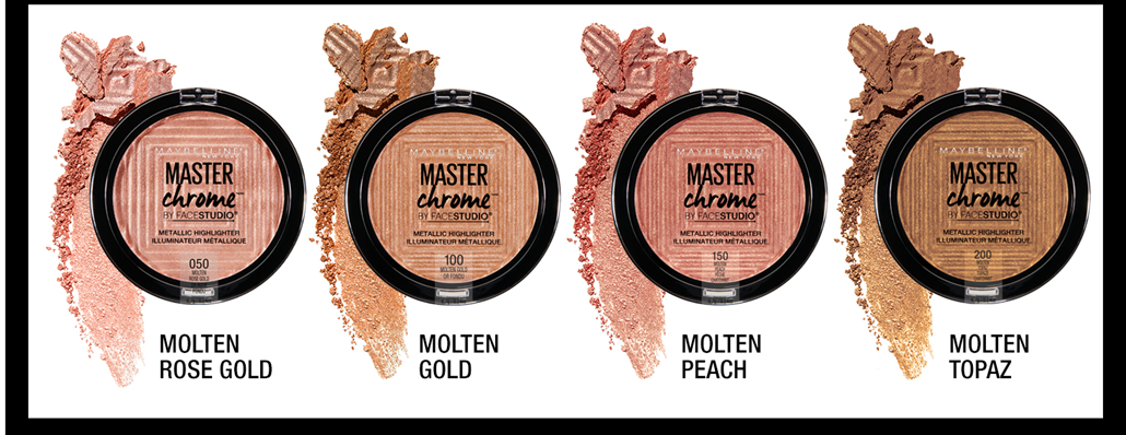 - Facestudio Master Chrome Metallic Highlighter Makeup: This highlighter powder drenches skin in a melted metallic finish; Maybelline's pearl pigments leave a reflective finish for a brilliant glowing skin