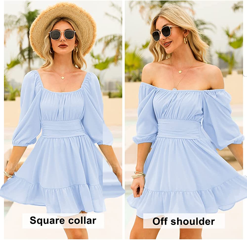 Feature: tie back, open back, square collar, ruched bust, smocked waist, elastic high waist, lantern sleeve, 1/2 sleeve, off shoulder, elastic cuff, above knee length, A line, slim fit, swing and elegant vintage style.