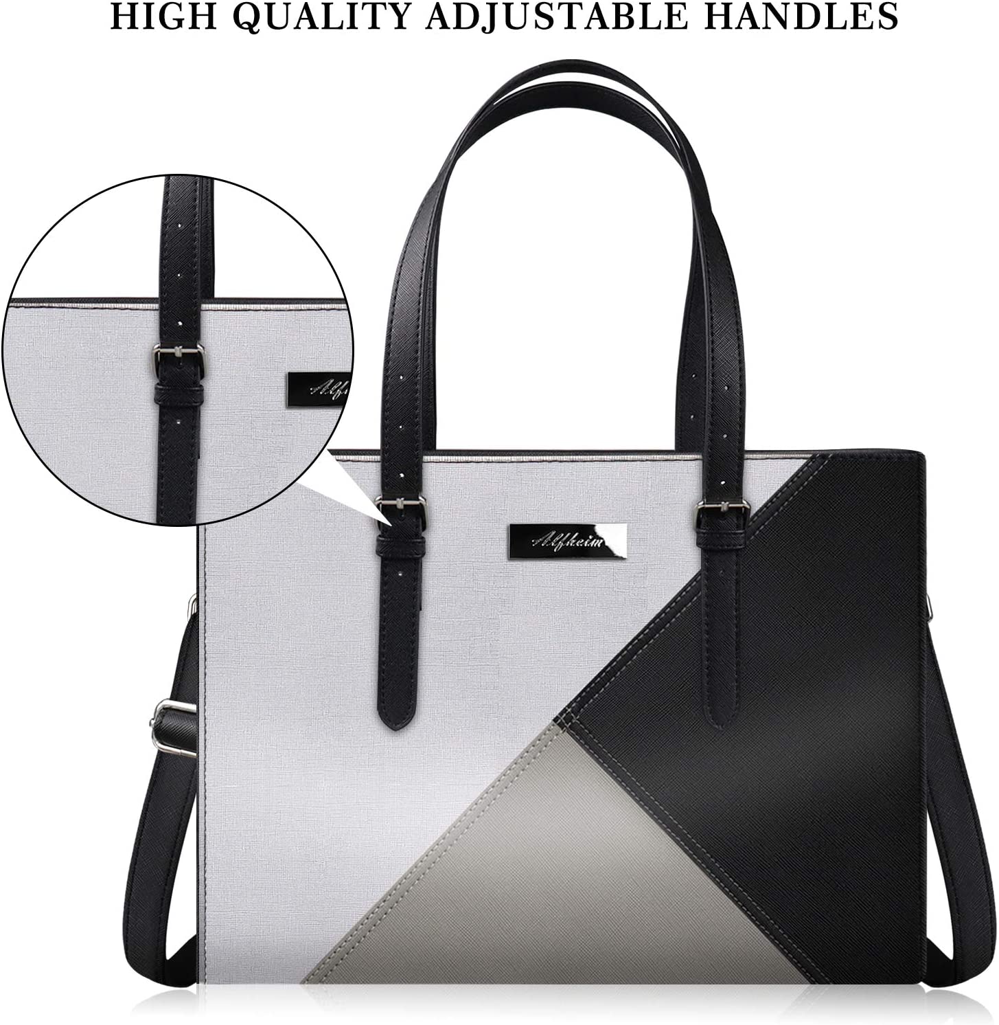 【Premium Material】Alfheim laptop bag is made of premium PU leather and polyester lining. High-quality leather makes laptop handbags for women water-repellent, scratch-resistant and more soft and durable. Adopting a sturdy top handle zipper and professional padded pocket which keep your laptop and essentials safe. The fashionable stitching color makes this large business woman bag become a forefront of fashion trends.