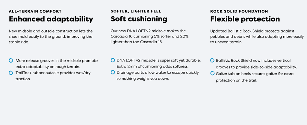 THIS WOMEN'S SHOE IS FOR: Trail Runners who want to explore and feel protected on changing terrain. This shoe is made to adapt quickly so runners stay comfortable and stable. Predecessor: Cascadia 15