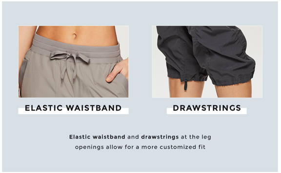 Elastic waistband and drawstrings at the waist and leg openings for a more customized fit
