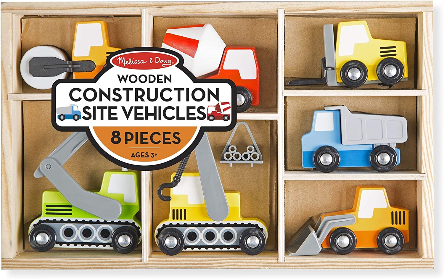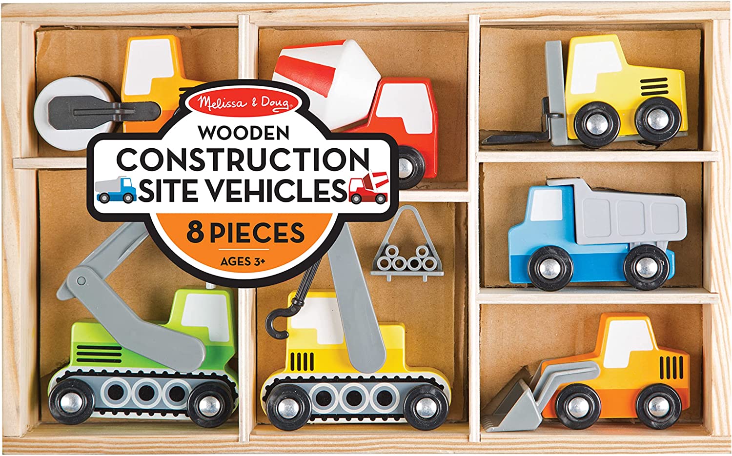 Melissa & Doug Wooden Construction Site Vehicles With Wooden Storage Tray (8 pcs) - Vehicle Toys, Cars For Toddlers And Kids Ages 3+