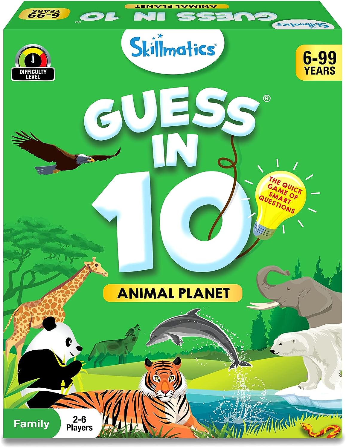 GUESS IN 10 ANIMAL PLANET CARD GAME OF QUESTIONS - Ask up to 10 questions to guess the animal on the Game Card! Is it a carnivore? Is it a domestic animal? Does it live in groups? Think hard, ask intelligent questions, use your clue cards wisely, and the be the first player to win 7 Game Cards! This game includes 52 Game Cards and 6 Clue Cards.