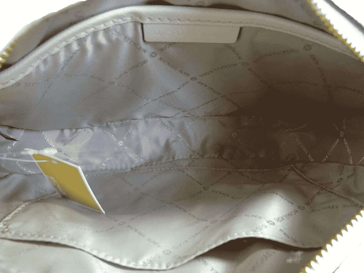 Zip Top Closure Michael Kors Logo At Front PVC Leather Gold Toned Hardware Custom Fabric Lining 2 Slip-in Pockets 10" (L) X 6"(H) X 2.5"(D)