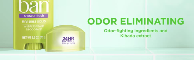 Ensure you'll stay protected from underarm odor and wetness for 24 hours by starting your morning with Ban Invisible Solid Antiperspirant. With odor-fighting ingredients and Kihada extract, the formula helps eliminate odor caused by bacteria breaking down sweat on your skin’s surface, and it helps to significantly reduce perspiration, so you'll feel fresher and dryer for longer. Ban Invisible Solid Antiperspirant in Shower Fresh features the classic clean, fresh scent of baby powder, but won't compete with your perfume or other scented products you may use. For nearly seven decades, Ban has been providing America with simple yet effective solutions for staying fresh all day. Our antiperspirants, available in a variety of scents, offer 24-hour protection from odor and wetness. Ban invented the first applicator based deodorant in 1954, the iconic roll-on, and has been a trusted name in underarm protection ever since. Satisfaction Guaranteed. Limitations may apply.