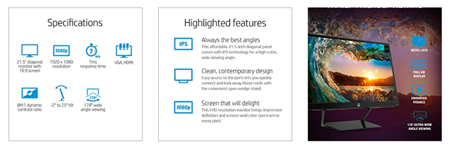 • WARRANTY AND SUSTAINABILITY – Rest easy and work confidently with an environmentally conscious and energy-efficient monitor, backed by HP standard 1-year limited warranty and shipped in completely recyclable packaging (4).