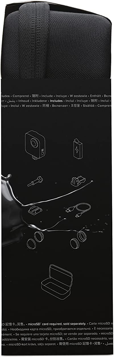 Includes: GoPro MAX Camera, Rechargeable Battery, Curved Adhesive Mount, 2 Protective Lenses, 2 Lens Caps, Microfiber Bag, Mounting Buckle plus Thumb Screw, USB-C Cable, Carrying Case