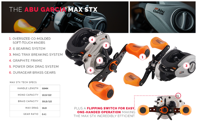 Experience better-than-ever Abu Garcia engineering with MAXimum performance with the Abu Garcia Max STX baitcast reels. These reels feature custom designed, co-molded handle knobs for increased comfort, a 5+1 bearing system for ultimate smoothness, and Duragear™ Brass gear for durability.