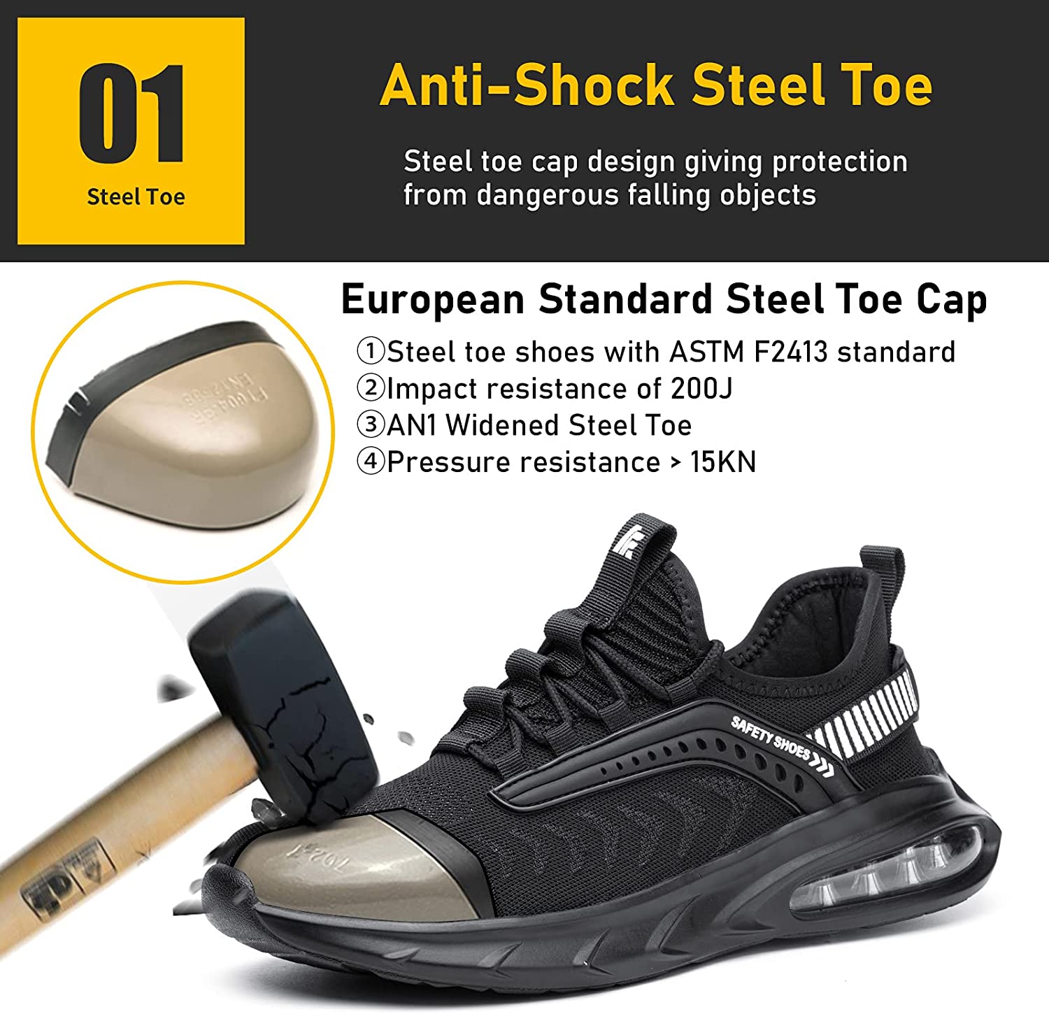 【Puncture Resistant】: Steel toe sneakers with lightweight Kevlar-midsole is built to protect your feet from being punctured by sharp objects like nails, steel bar.