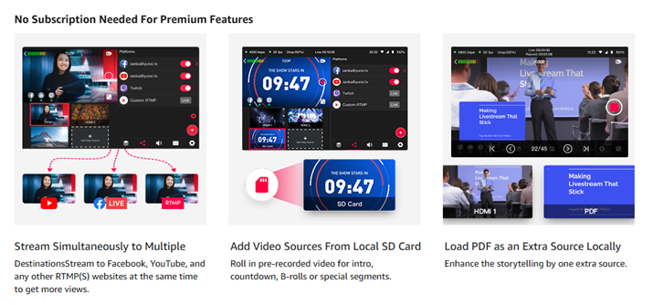 - 【Desktop features you won’t find anywhere else】 No subscription needed for multi-streaming to up to 3 platforms simultaneously; No subscription required for Featuring Comment Overlays to the Stream to engage with your audience in real time. All customizable graphic overlays(Logos/Watermarks/Customized Rolling /Captions/Scoreboard/Lower-Thirds To Make Your Stream Look Pro) are all built-in with no additional cost.
