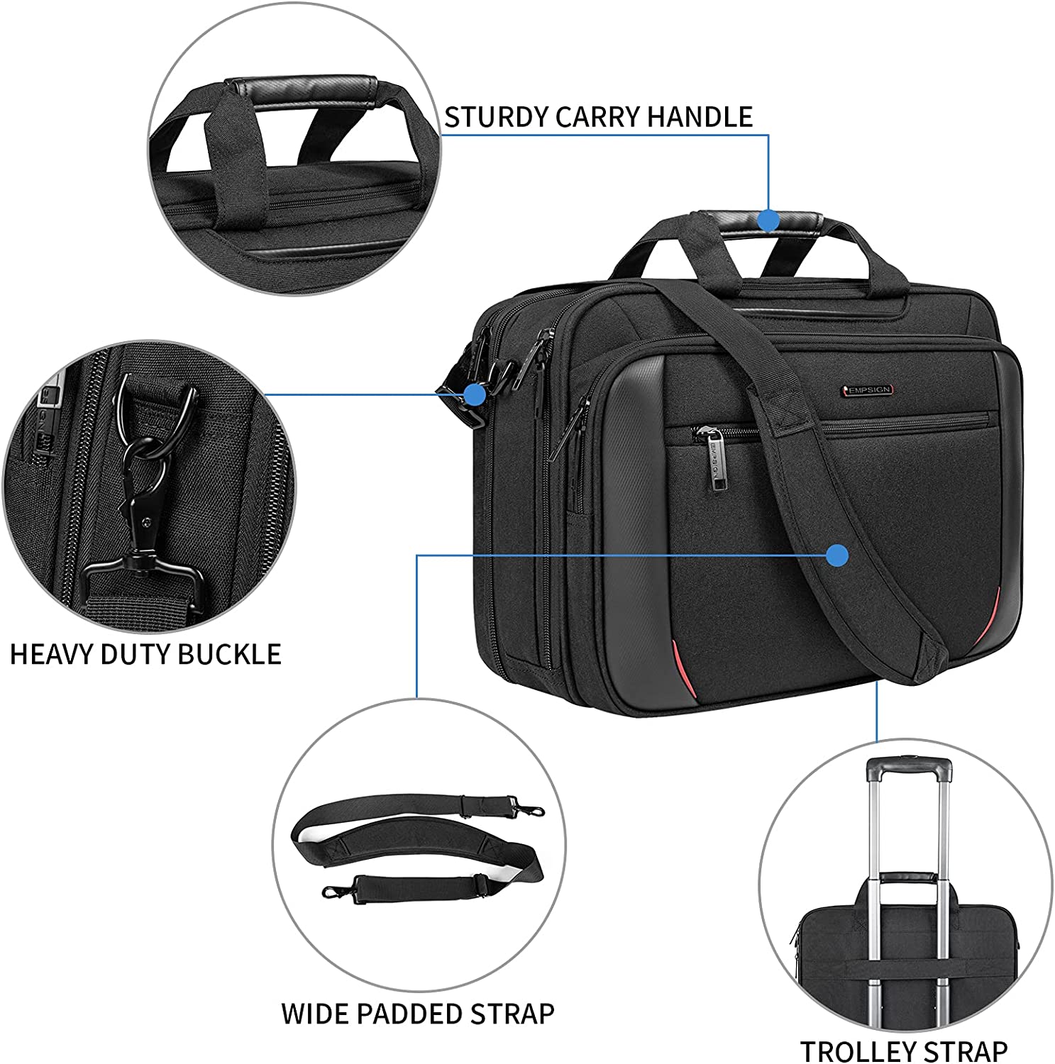 - COMPREHENSIVE WORKSPACE: Large capacity laptop bag accommodates your laptops, tablets, mouse, chargers, storage drives, papers/folders, business cards, keys, and other on-the-go essentials. Features multiple organizational pockets allowing you to organize all your items in one computer bag—no fumbling to find stuff! Expansion zipper provides more room to handle more carrying needs.