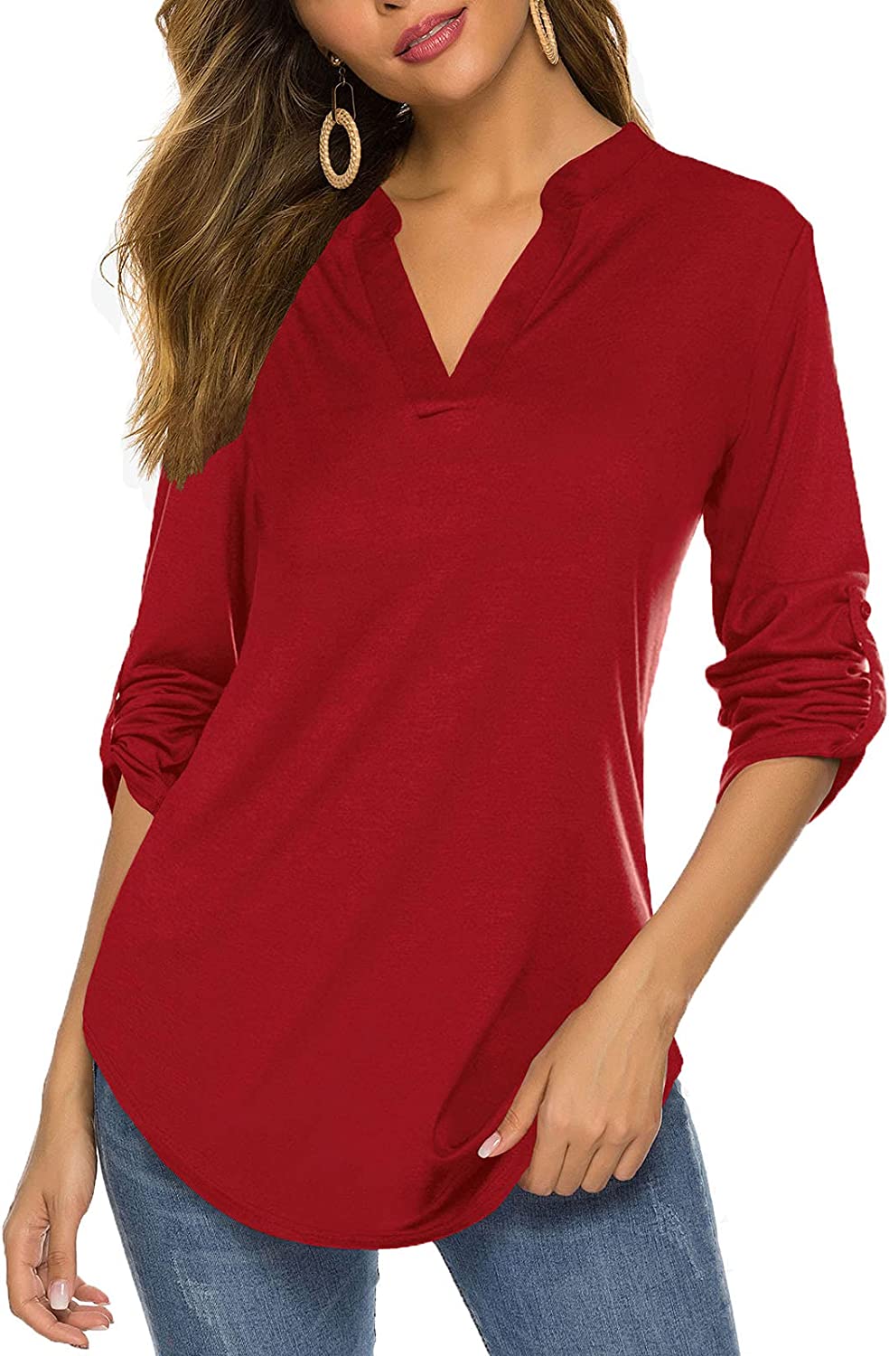 Elegant Design, roll up 3/4 sleeve shirt, long sleeve tunic, v neck shirt, solid color, hip length, pleated flowy style. The fashionable henley shirt makes this lightweight blouse timeless fashion, which makes you both chic and classic.