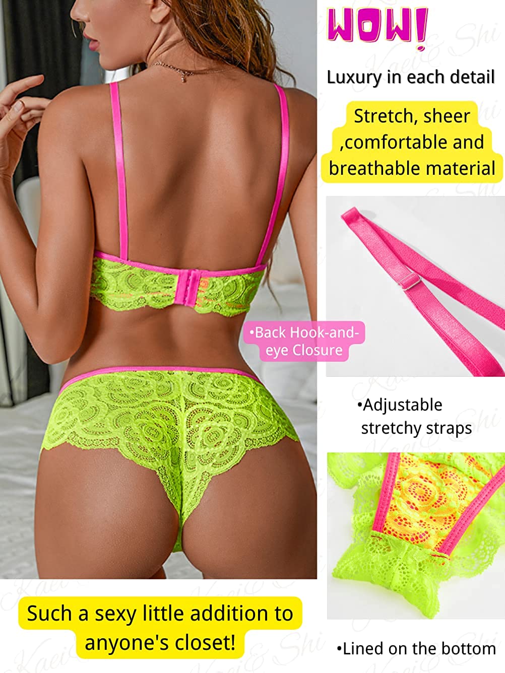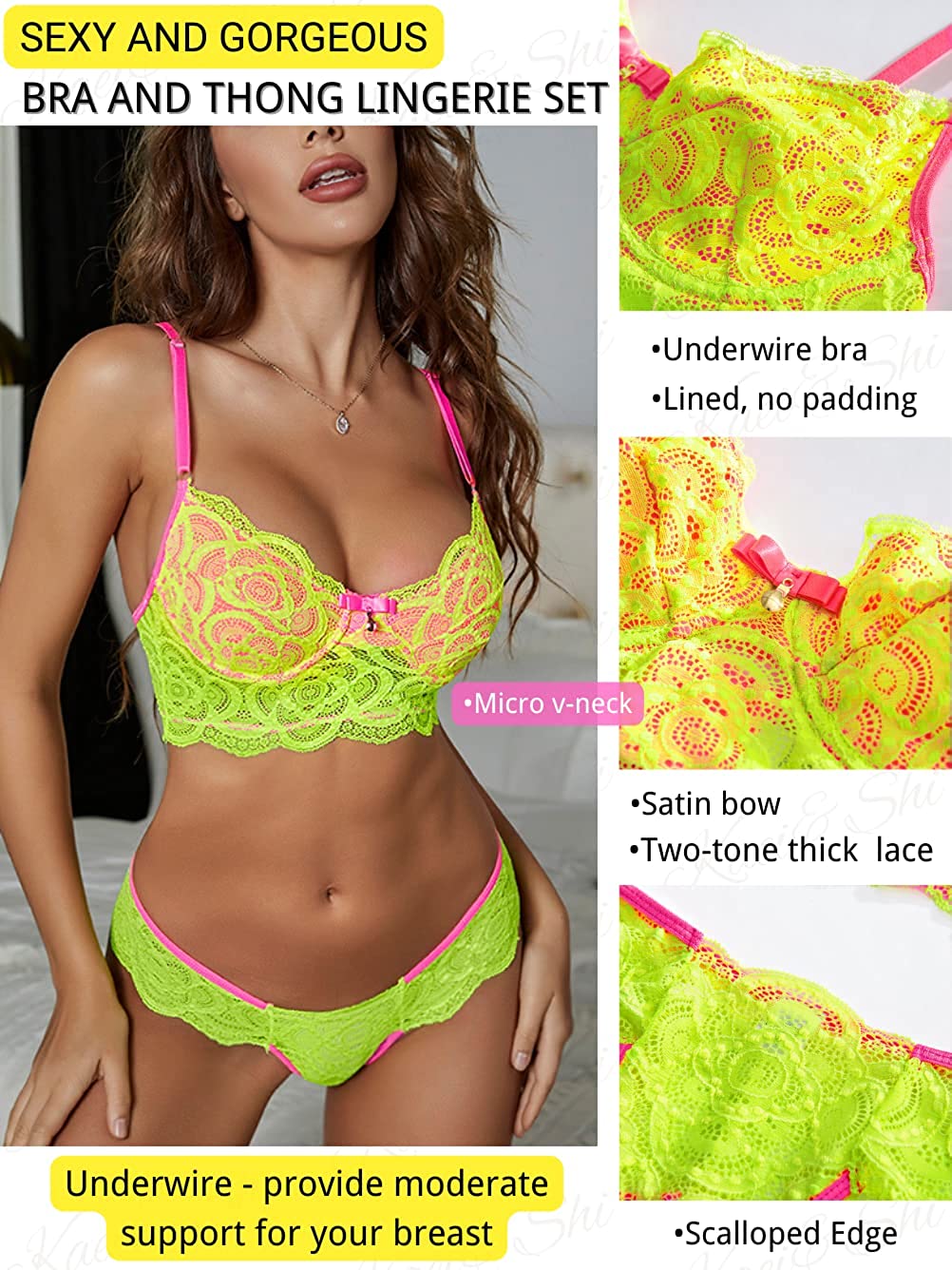 ✿Feature: This matching bra and panty set is featured with fluorescent, two tone, bow detail, spaghetti strap, scalloped trim which shows your curve beautifully.