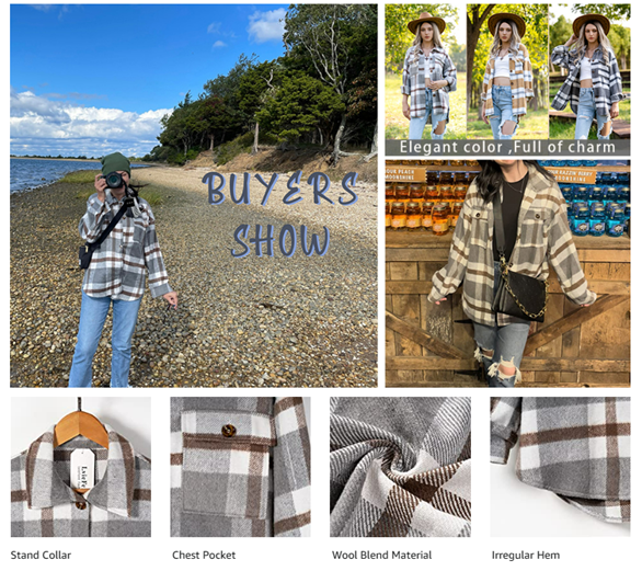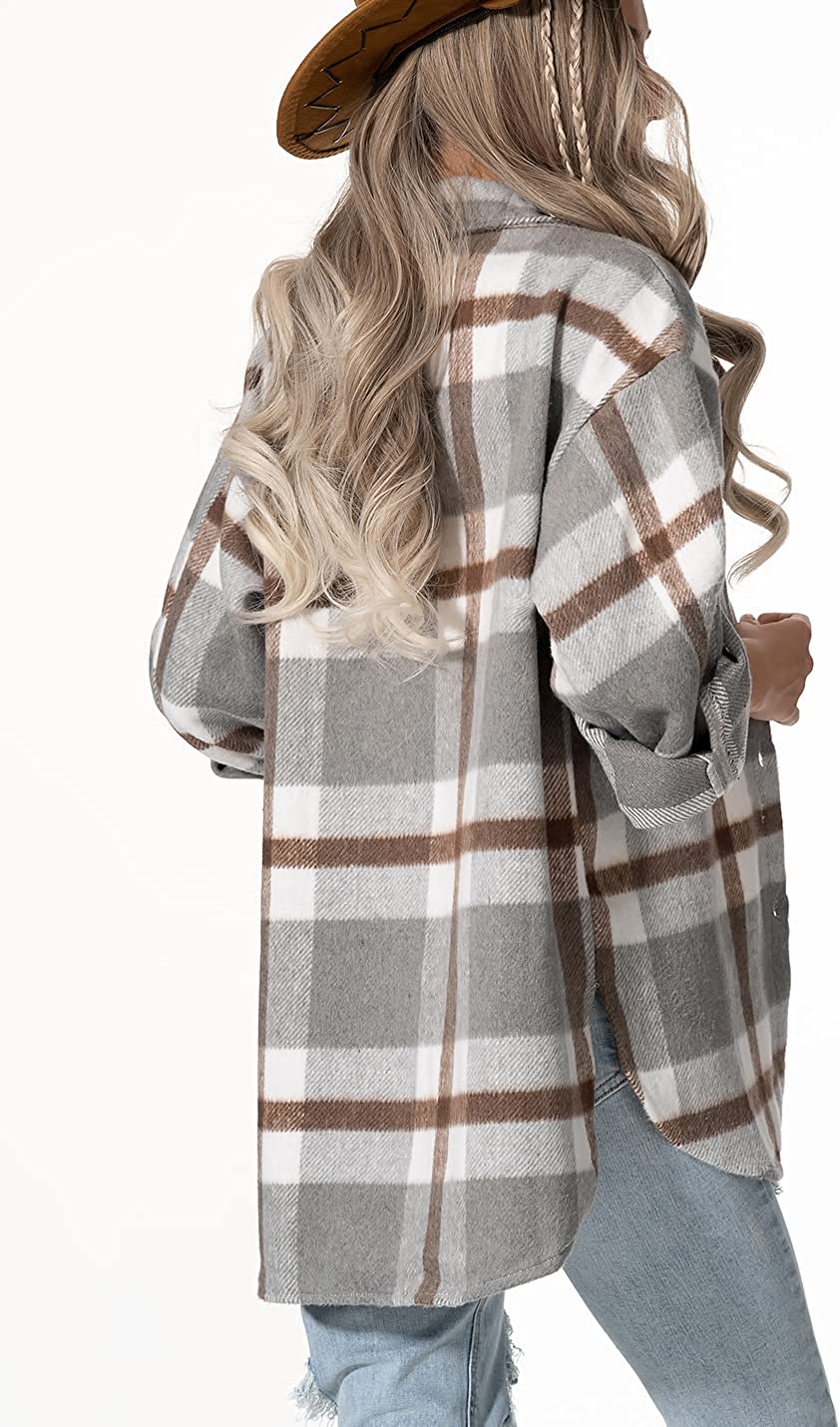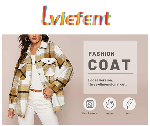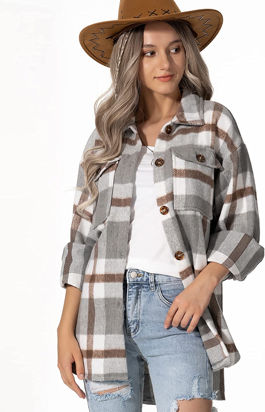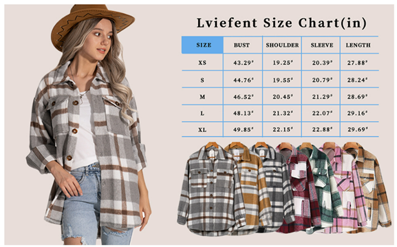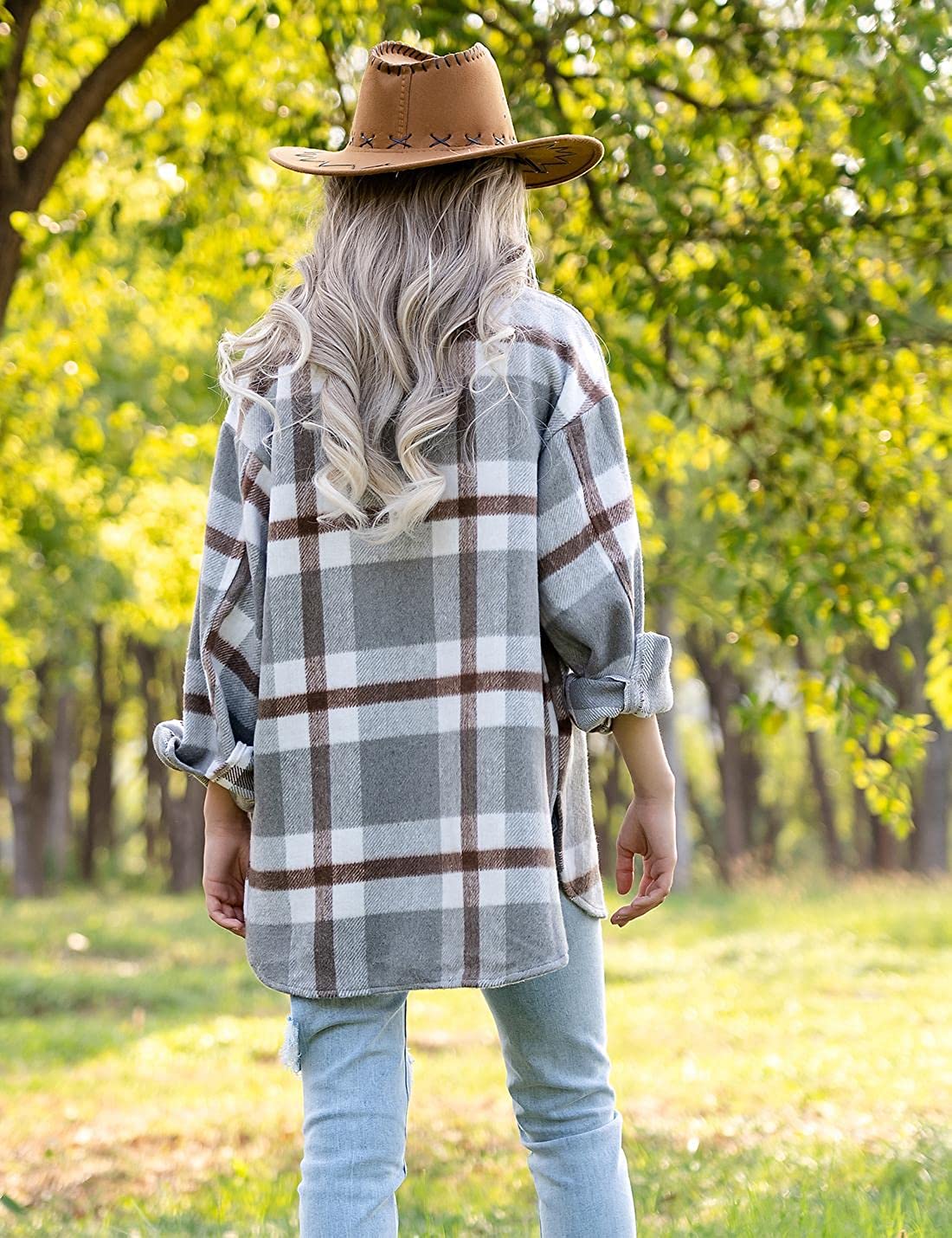 Feature: fall winter wool blend plaid shirt jacket, casual winter jacket for women, lapel collar turn-down collar long sleeve oversized flannel shackets jacket with front button placket, color block contrast plaid print button down shirts for women lady girls