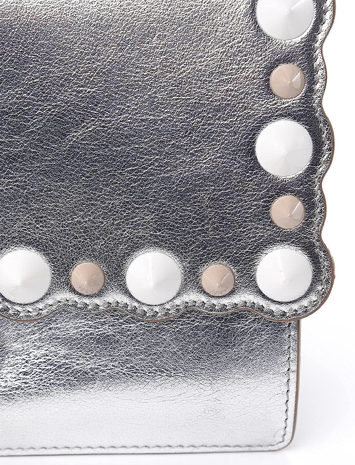 This shoulder bag is crafted of smooth calfskin leather in metallic silver with scalloped edges. This shoulder bag features a long polished silver-tone chain link strap with a shoulder pad and silver rings on the anchor to hold bag charms. The front flap has a decorative pyramid stud closure. The front opens to a partitioned grey suede interior with a patch pocket. This handbag is perfect for day or evening use, from Fendi!