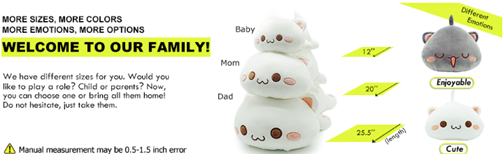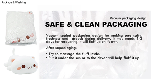 - Important Note : The plush kitty comes by vacuum packaging, so it is flat, after you unpacking, please do something make the cotton Loose then it will recover full within 1-2 days, put it in the sun or to the dryer, it will recover better, thank you for your understanding.