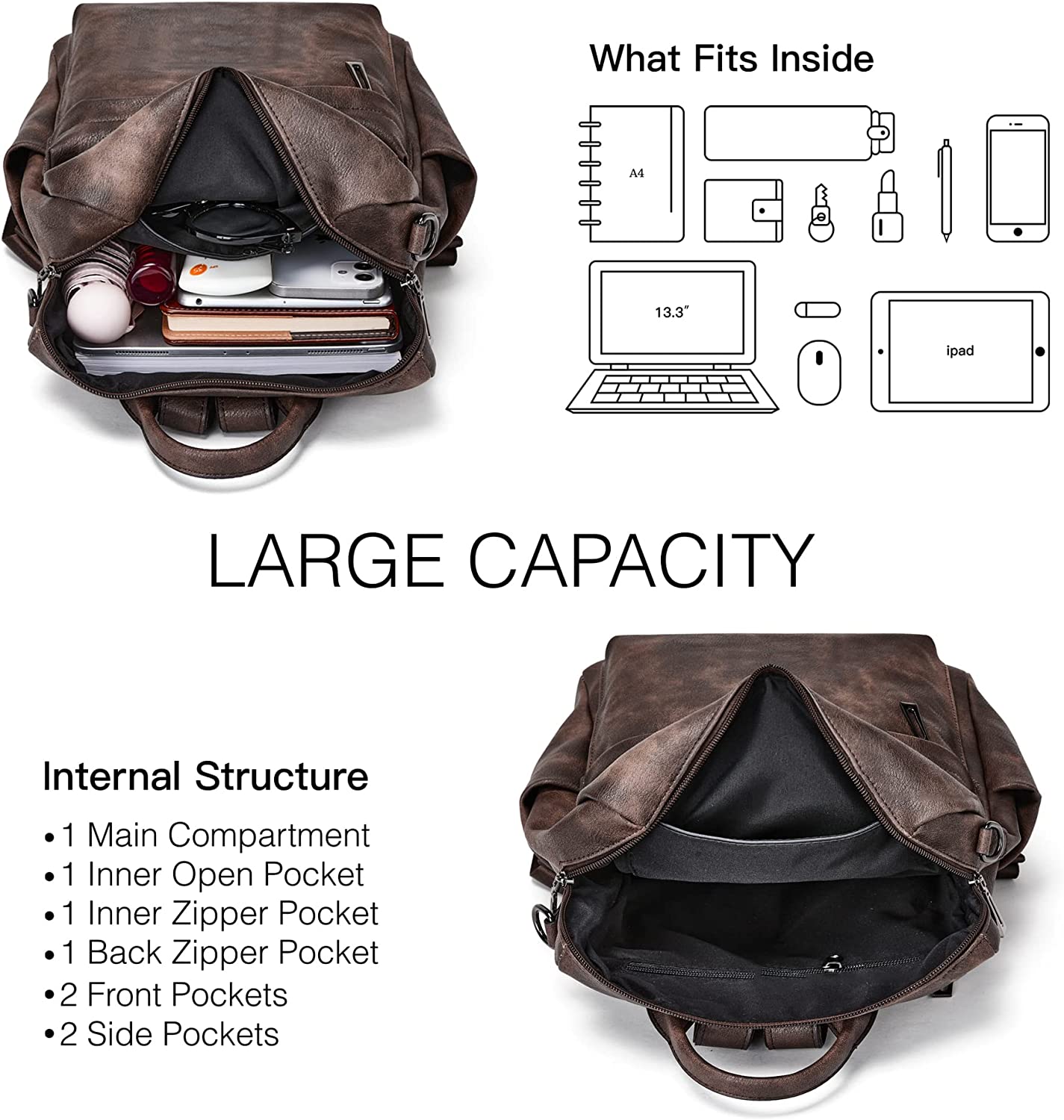 • 【CONSTRUCTION & LARGE CAPACITY】 This leather backpack purse for women adopts a double zipper with a large vertical opening at the top, which is very convenient for loading items. 1 interior zipper pocket, 1 interior slot pocket, 2 front zipper pockets, 2 side pockets, and 1 back zipper pocket. Multiple pockets can keep your things well organized.