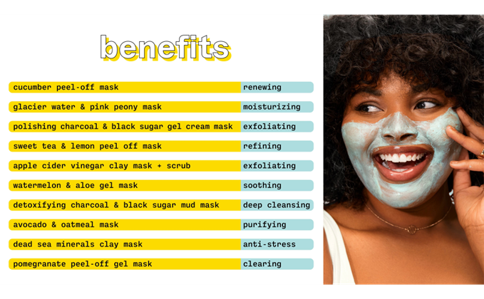 • Includes: (2) Cucumber Pink Salt Masks, (2) Manuka Honey Masks, (2) Sweet Tea Lemon Masks, (2) Charcoal Black Sugar Masks, (2) Glacier Water Pink Peony Masks, and (2) Dead Sea Minerals Masks
