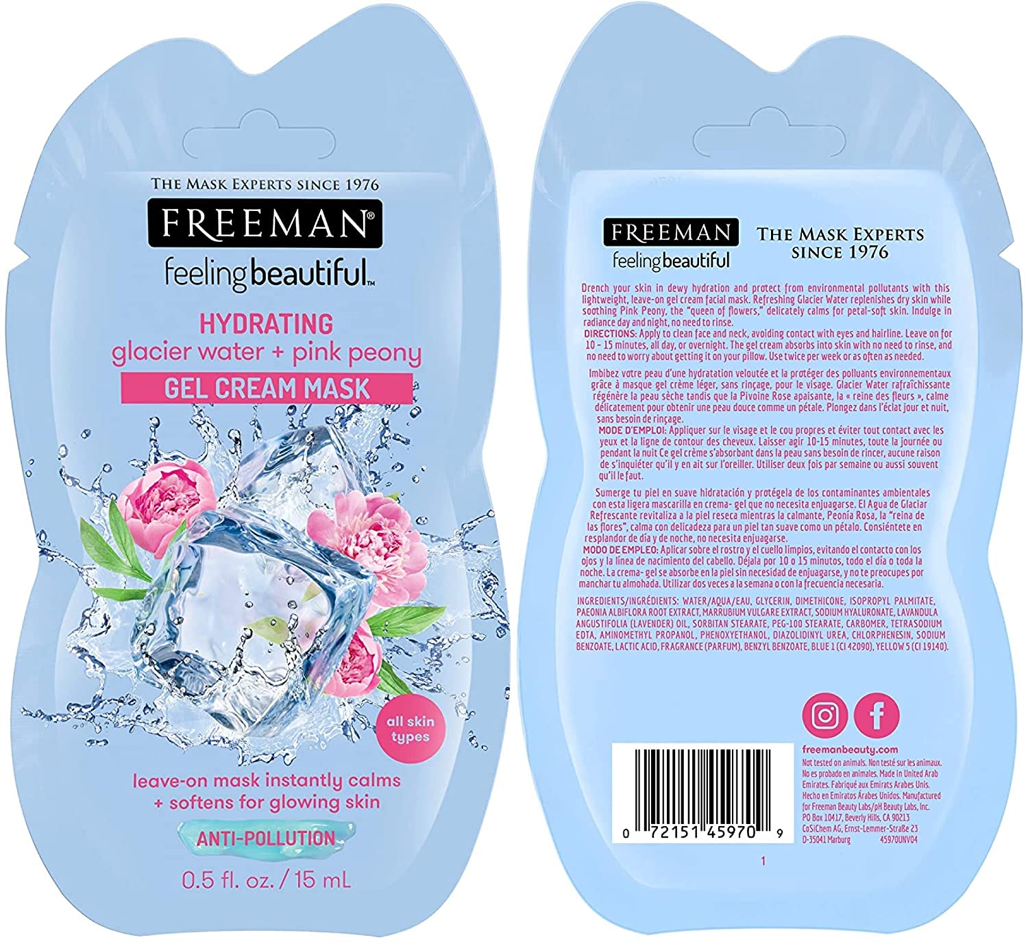 • Hydrating Glacier Water + Pink Peony Gel Cream Mask leave on mask instantly calms and softens for glowing skin
