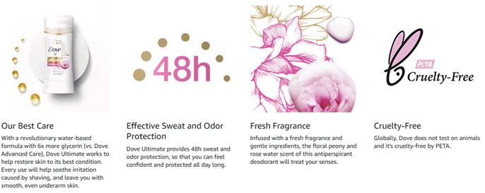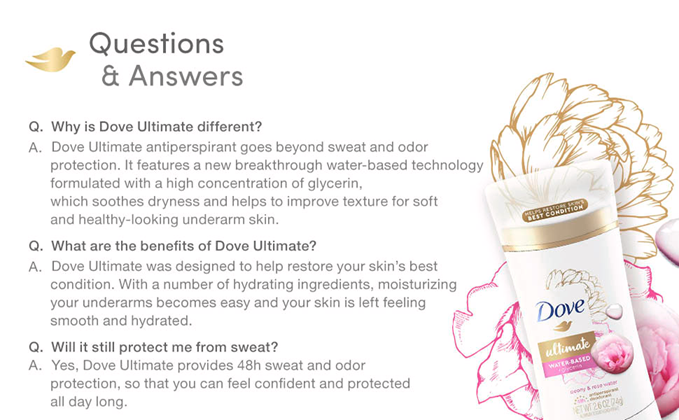 • A FRESHER FRAGRANCE: Dove Ultimate Antiperspirant Deodorant treats your senses to a long-lasting subtle floral fragrance infused with a fresh peony and rose water scent