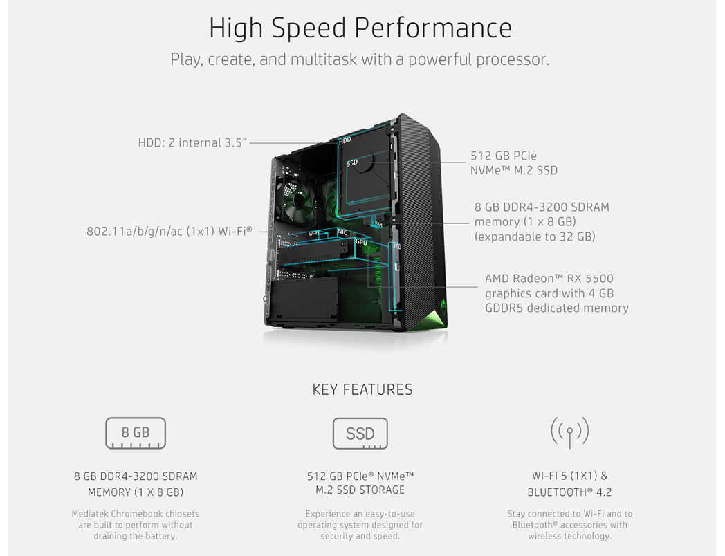 - PHENOMENAL GRAPHICS – Your favorite game titles look incredible and will run at their highest-fidelity thanks to the power-efficiency AMD Radeon RX 5500 graphics card with 4 GB GDDR5 dedicated memory