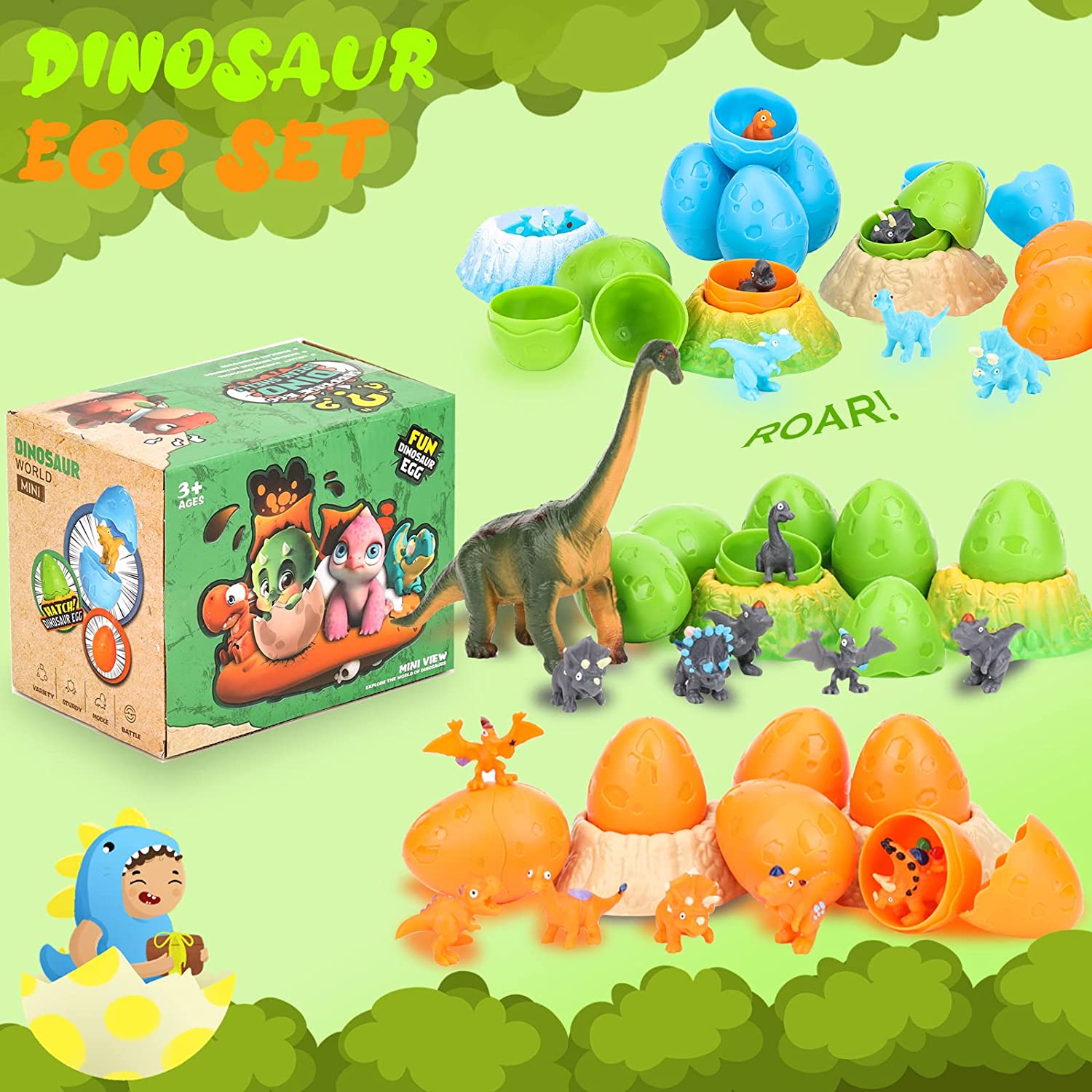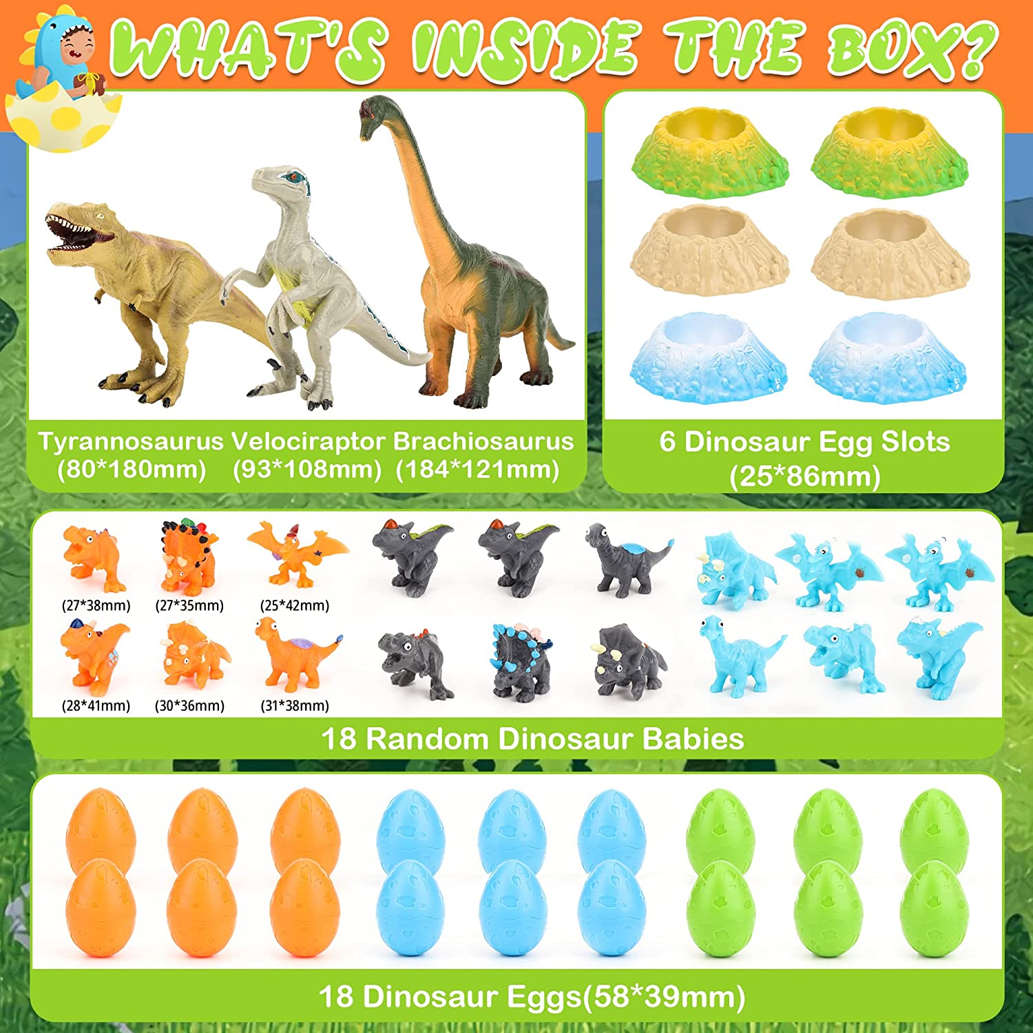 18 dinosaur eggs, 18 random small dinosaurs and 6 dinosaur egg slots. Children don't know what type of dinosaur is inside the egg until they open it.