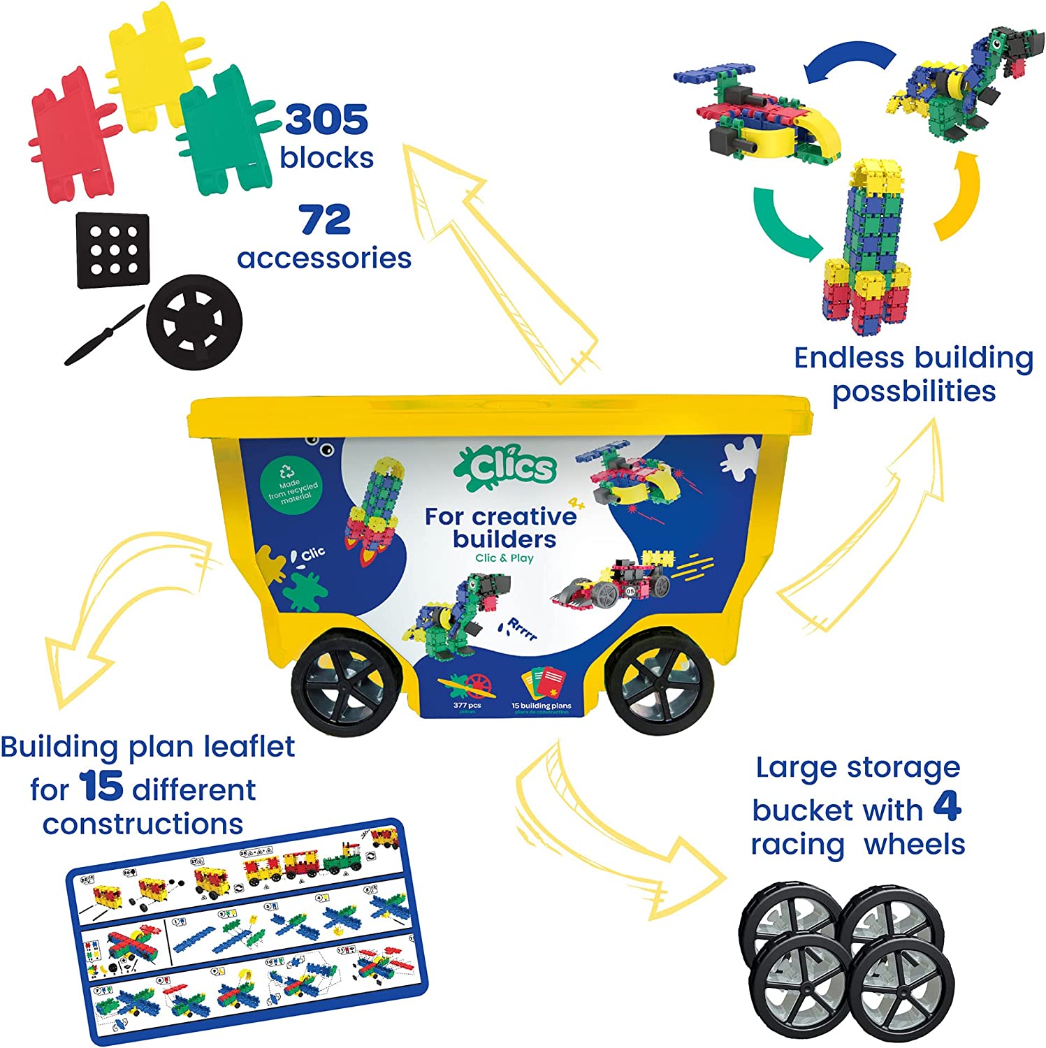 Clics Basic Set of 377 Pieces, Construction Toys for 3 Year Old Boys and Girls, rollerbox of Blocks to Learn Shapes and Colors, Educational STEM Toys. No BPA, PVC. Dishwasher Safe, Recycled Plastic.
