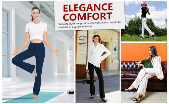 DRESS PANTS FOR WOMEN: (87%Polyester 13%Elastane) Belt loops, zipper fly with button, streamlined design, make these pants professional enough for business casual, work, office, yoga or golf.