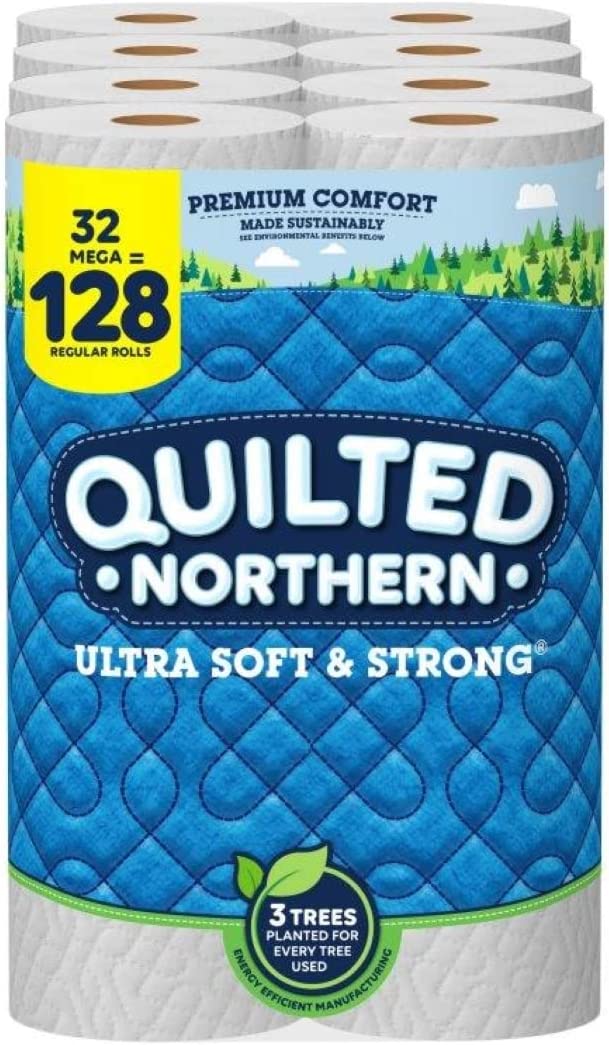 Each pack contains 32 Mega Rolls of Quilted Northern Ultra Soft & Strong toilet paper.