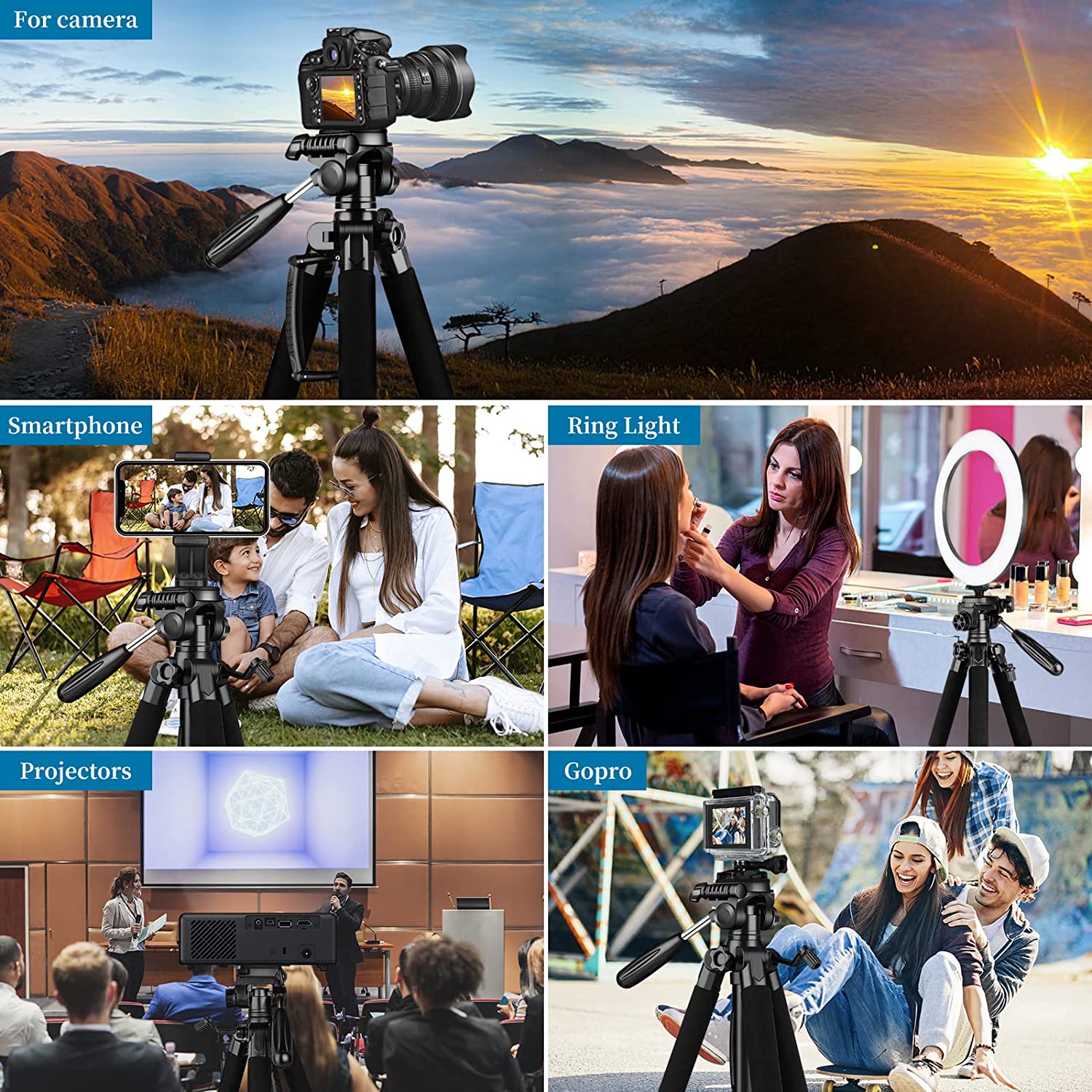【Tripod for All Camera and Phone】Standard 1/4" screw mount and 3/8" screw compatible with all cameras ( Canon, Nikon, Fujifilm, Olympus, Panasonic), DSLR, SLR, and digital cinema cameras, also spotting scopes, projector, compact camcorders, binoculars. The 360° phone mount is compatible with iPhone 14 13 12 11 Pro/XS/XR/MAX/8/8 Plus/X/7 Plus/7/6s Plus/6s/6 Plus/6/Samsung Galaxy S22/ S21 Series/ Galaxy Z Flip/ NOTE/ One Plus 1+Series.