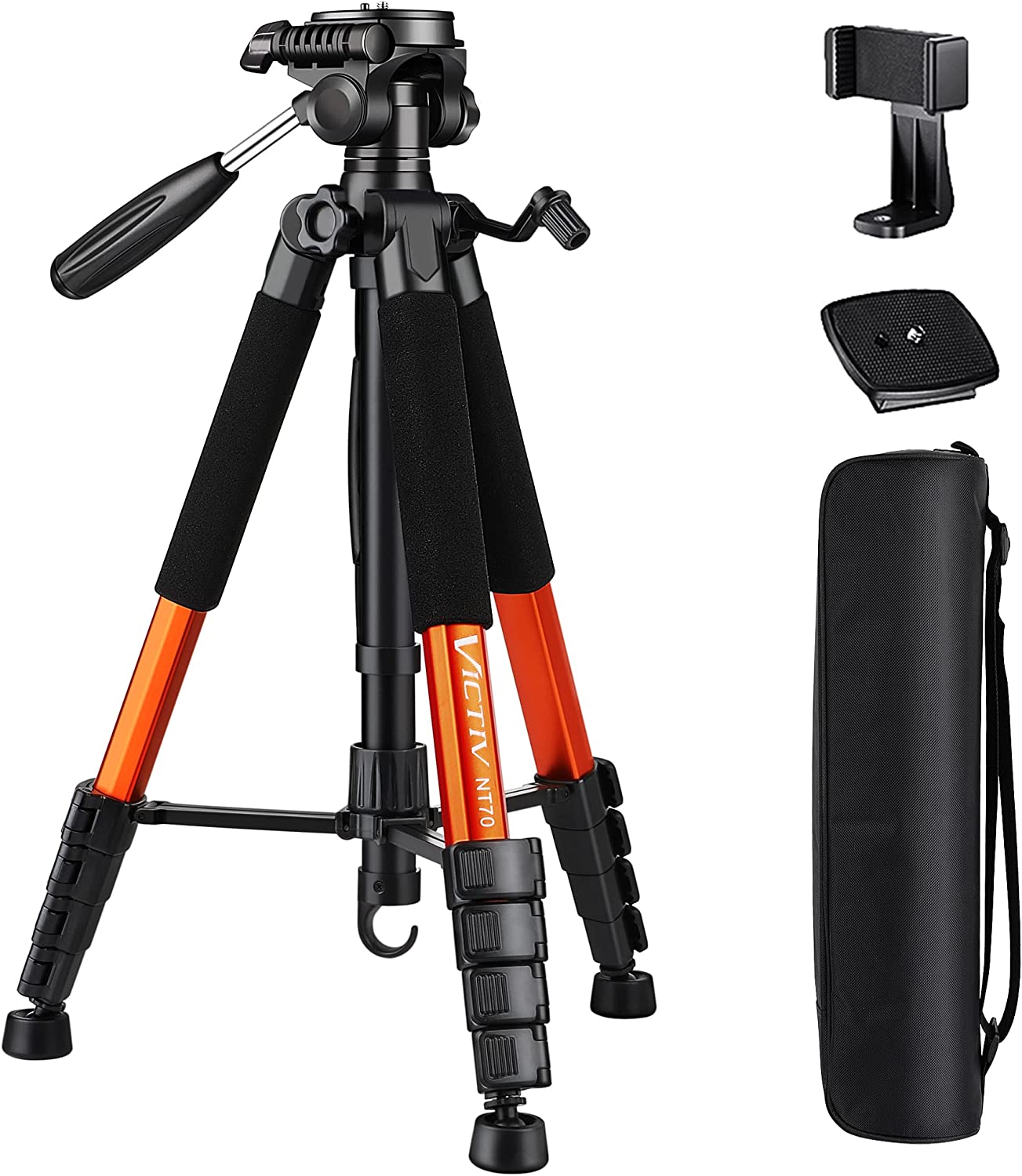 【Professional 3-Way Pan Head】VICTIV Professional camera tripod stand is equipped with a stable and smooth 3-way pan head, it allows 360° horizontal panoramic shots, 180° up and down shots, and 90° vertical portraits. Non-slip pads provide great grip. You can also hang a backpack on the weight hook for extra stability.
