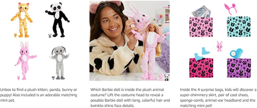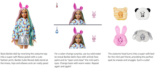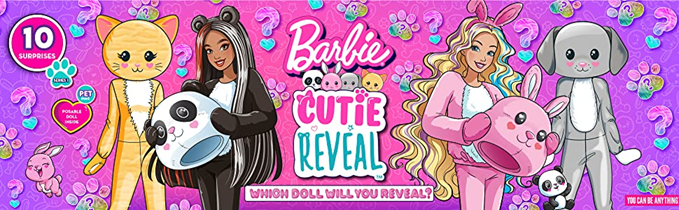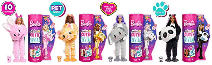 With so much cuteness in one package, kids will want to find and collect all the dolls in this Barbie Cutie Reveal series! (Hint for grown-ups: the package illustration shows which doll is inside.)