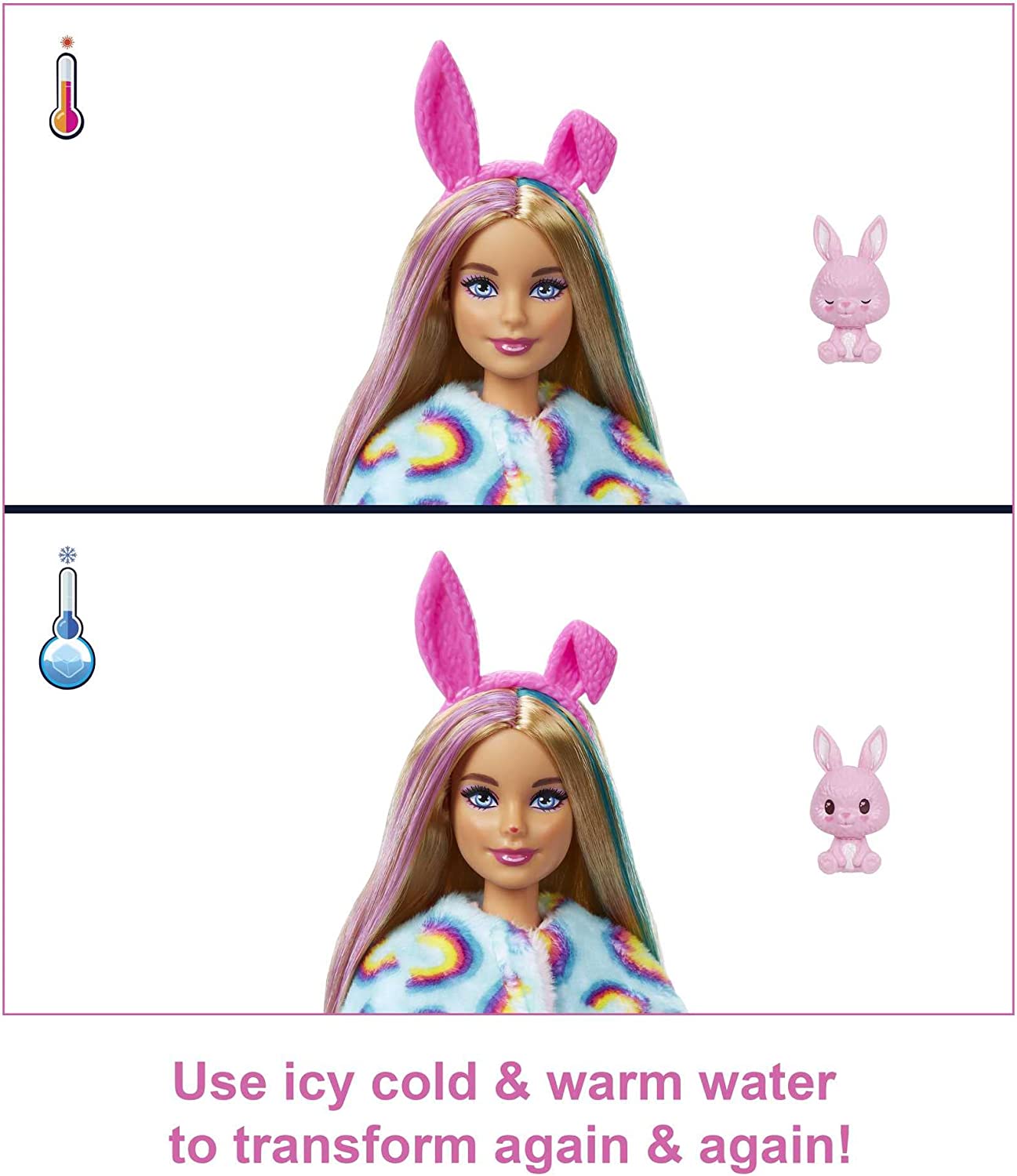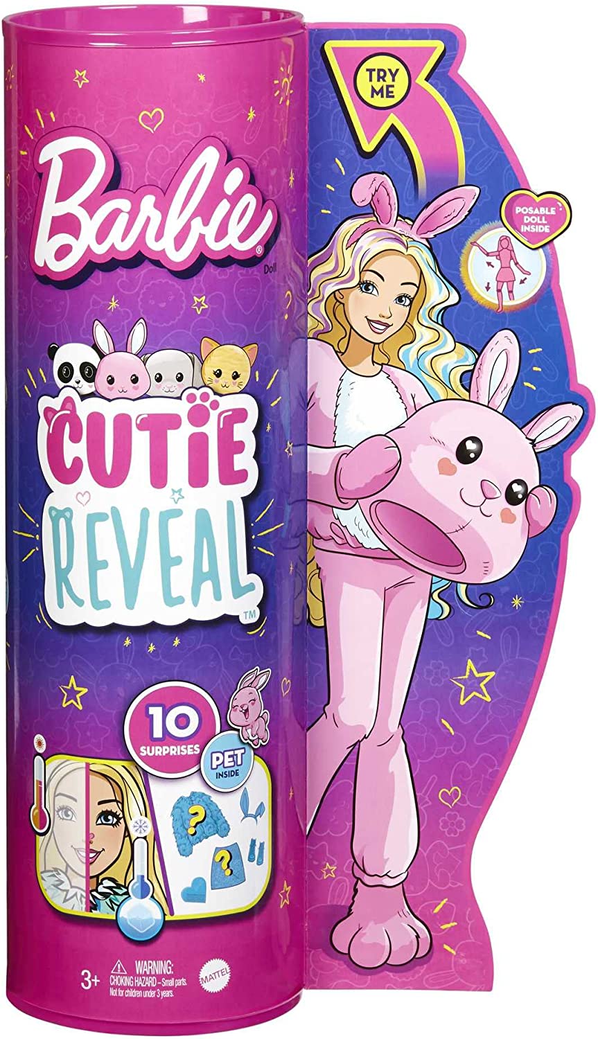 Barbie Cutie Reveal dolls offer the cutest unboxing experience with 10 surprises, including a posable Barbie doll! Unbox the package to find a soft, plush bunny friend and four surprise bags. Remove the bunny costume to find a Barbie doll with long hair and twinkle-shine details. Open the surprise bags to find shimmery clothes, accessories, a sponge-comb and a mini pet bunny. Kids can dress and accessorize Barbie doll -the costume top reverses and becomes a super-soft fleece jacket, and the costume head also turns into a pet bed! The surprises continue with color-change cuteness. Animal face paint appears on Barbie doll's face, and her pet bunny "opens and closes" its eyes -such a cutie! Just use the sponge-comb and ice cold water to activate; change back with warm water. Discover all the cute surprises with this Barbie Cutie Reveal series. Includes doll in animal costume and 10 surprises. Doll cannot stand alone. Colors and decorations may vary.