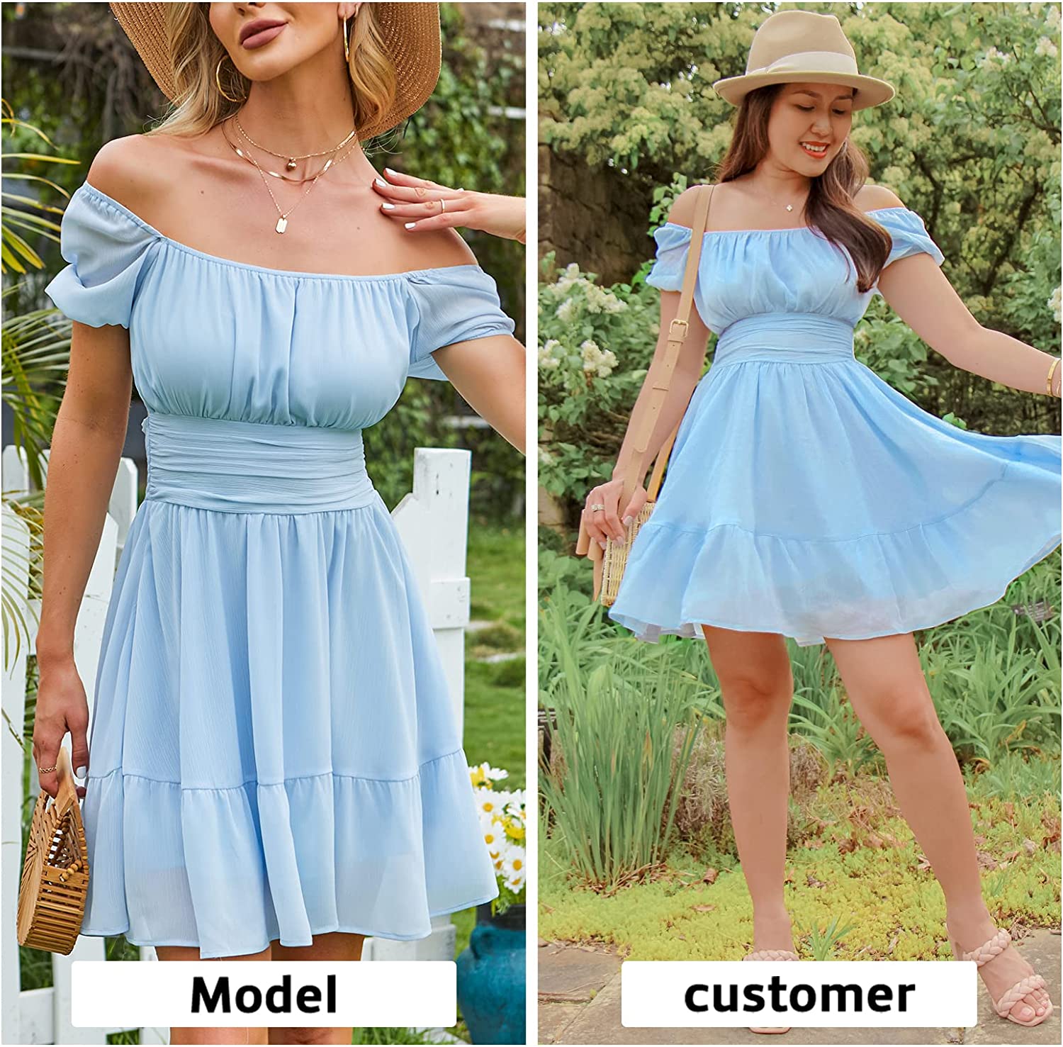 Feature: With elasticity in neckline and waist, the smocked dress flatters most body shapes for a comfortable fit. Plus, the dress features an open-back framed with adjustable ties, showcasing your beautiful back while having a comfortable feeling of wearing. The ruffle frill hem combined with off shoulder or square neckline, sexy design serves as a feminine touch to your outfit and elevates your look.
