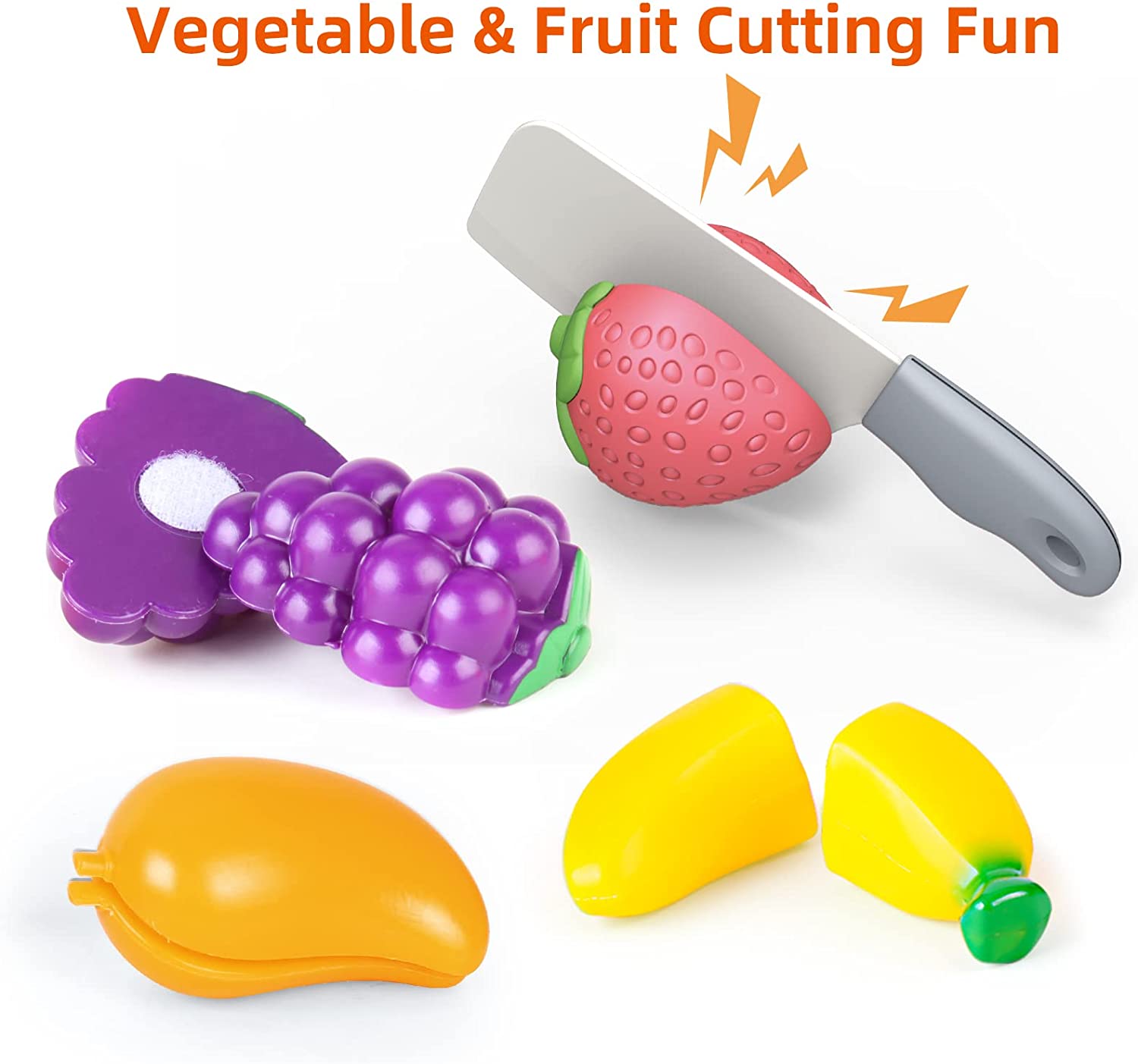 【Realistic Kitchen Cooking Toys】Colorful play fruit and vegetables can be cut and peeled, the cutting toys make a crispy chopping noise which provide a realistic experience for your kids.