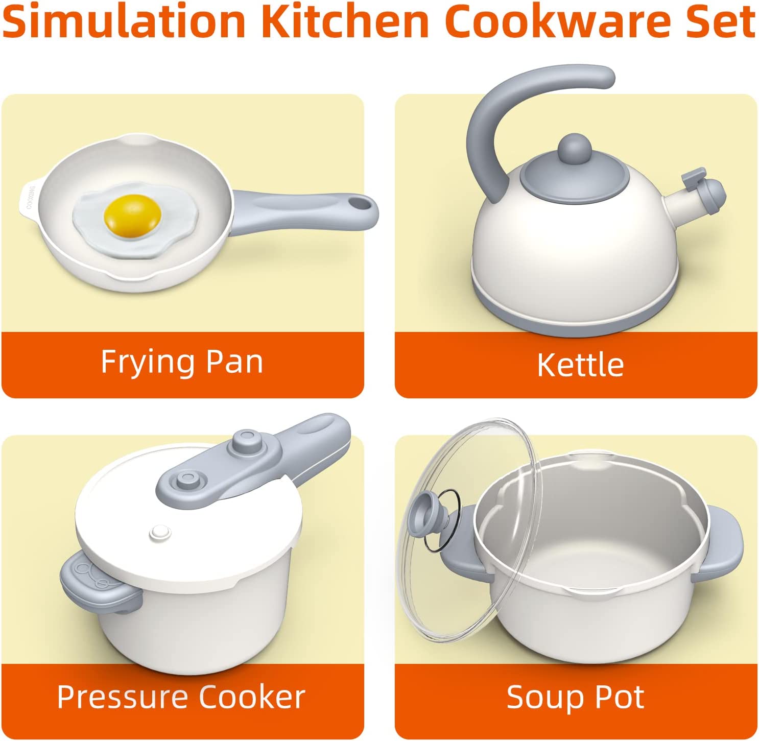 【76 PCS Play Kitchen Toys Set】Total 76 pieces all in this kitchen play set, more accessories than other similar set! Includes a pan, a pot, a pressure cooker, a kettle.Moreover, these kitchen toys also come with play kitchen food with different vegetables, fruits, fast foods, seafood, and dessert .