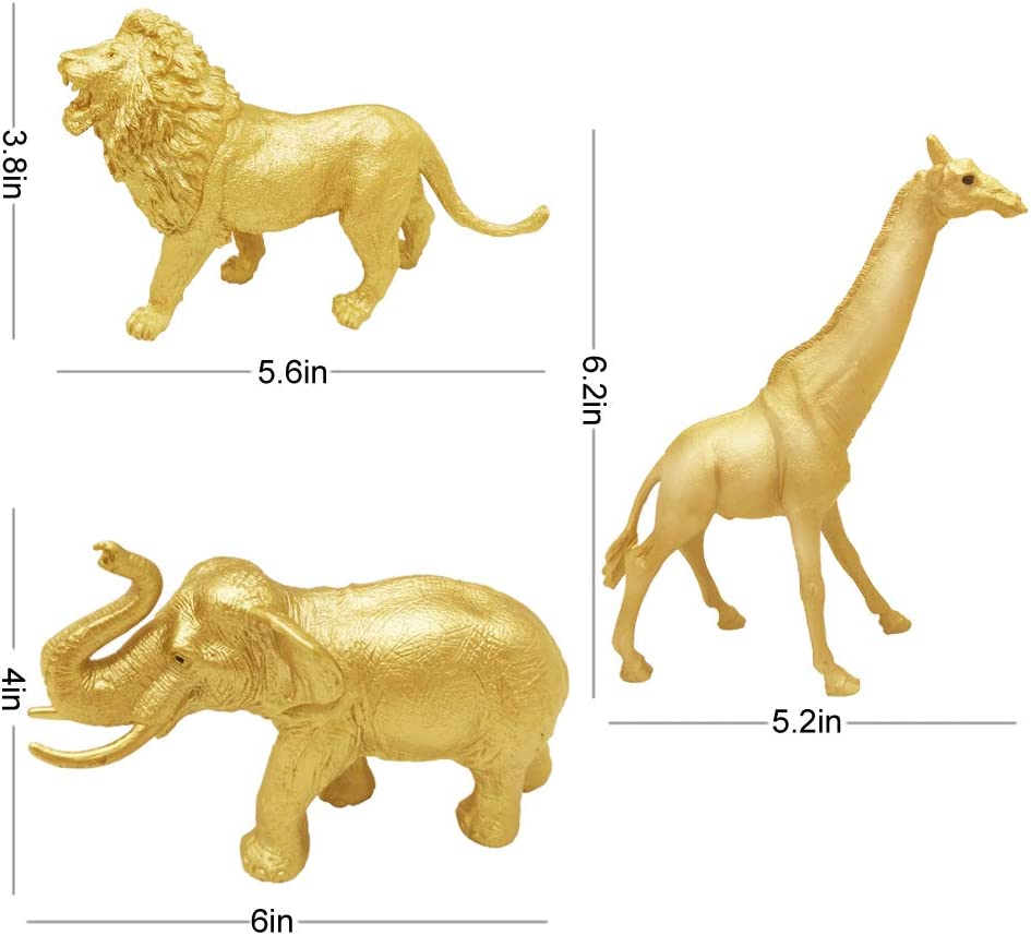 WHAT'S INCLUDED: 12 piece golden animal figurines set includes 3 giraffes, 3 elephants, 2 elk, 1 lions, 1 tiger, 1 rhino, 1 hippo.