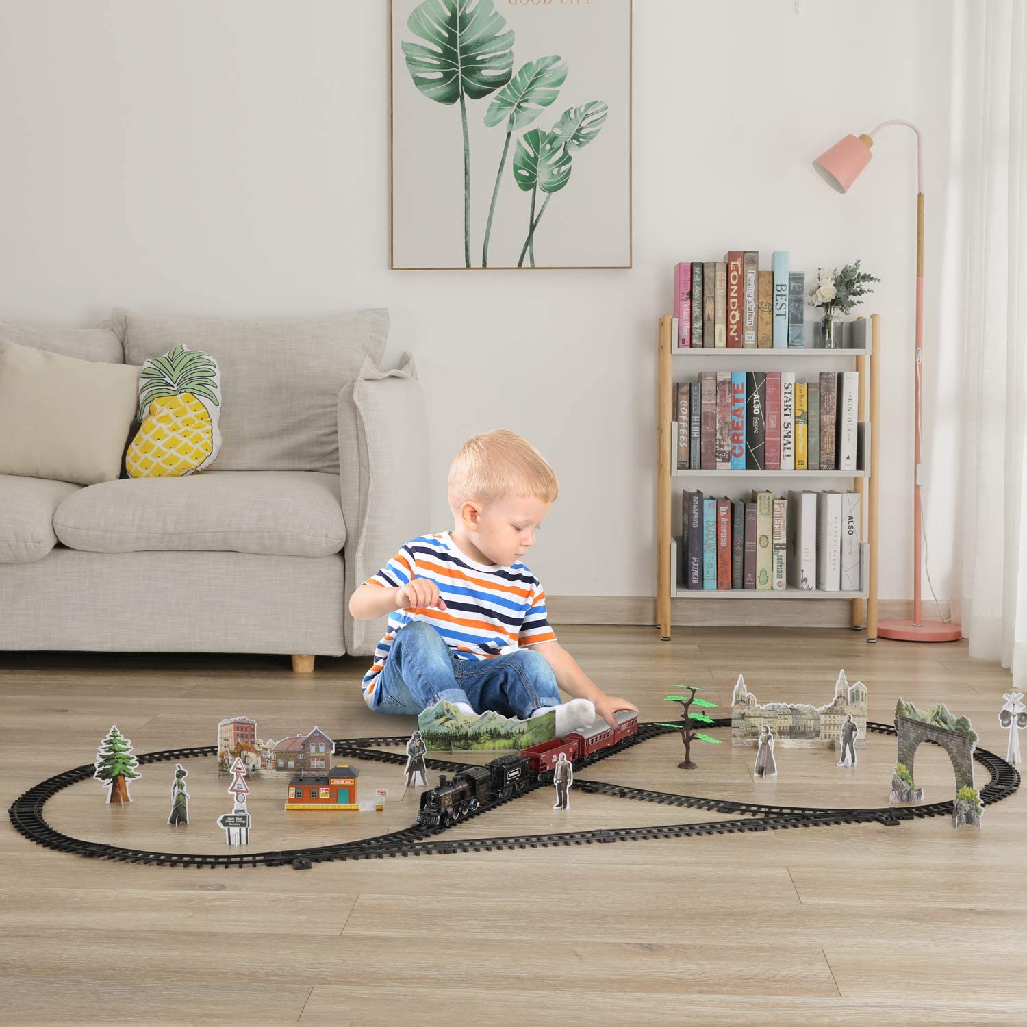 - Includes: locomotive steam engine, a passenger coach , a cargo vehicle, a coal car,tracks ,Traffic signs,European architecture and figures.Dimension: 71.2’’ (L) x 30.7’’ (W) long oval layout of track ,+ inner loop expansion