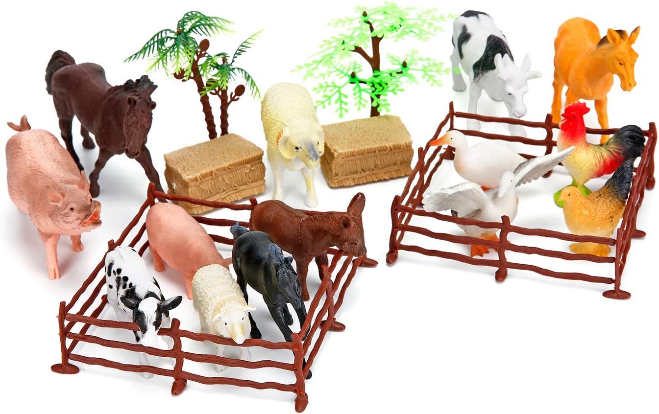 26 Pieces farm playset Includes 10 piece mother and baby farm animals toys includes horses, pig, donkey, sheep, dairy cattle; 1 x duck, 1 x swan, 1 x rooster, 1 x hen, 8 x fence, 2 x bales of hay, 2 x tree.