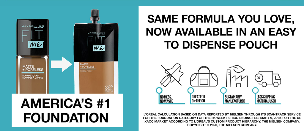 - Fit Me foundation is also available in a pouch pack with controlled dozer; you can squeeze and use until the last drop; It's produced with renewable energy and minimum plastic; Put your best face forward: find your Powder, Concealer, Blush FIT